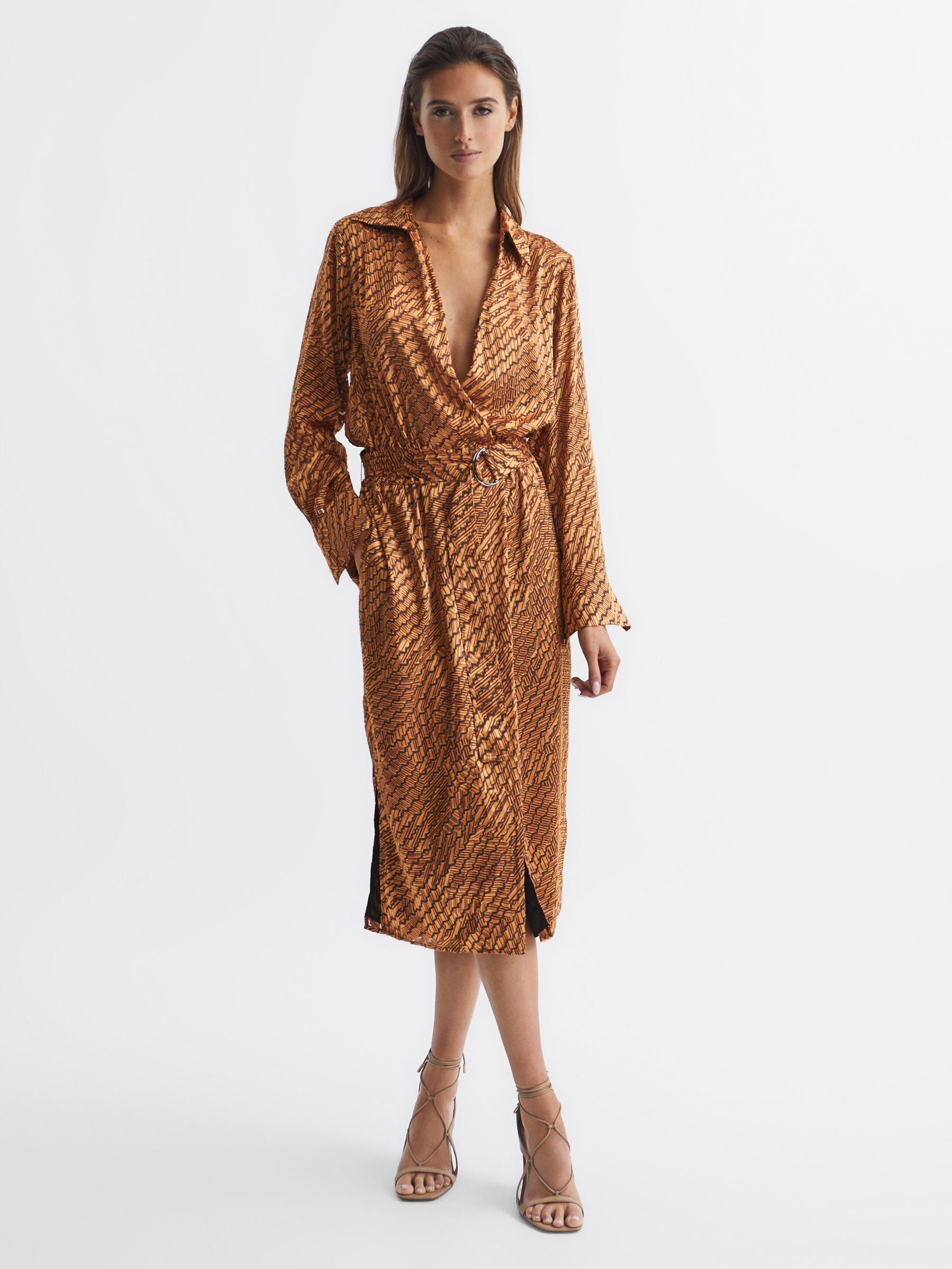Devoure Print Belted Midi Dress in Bronze
