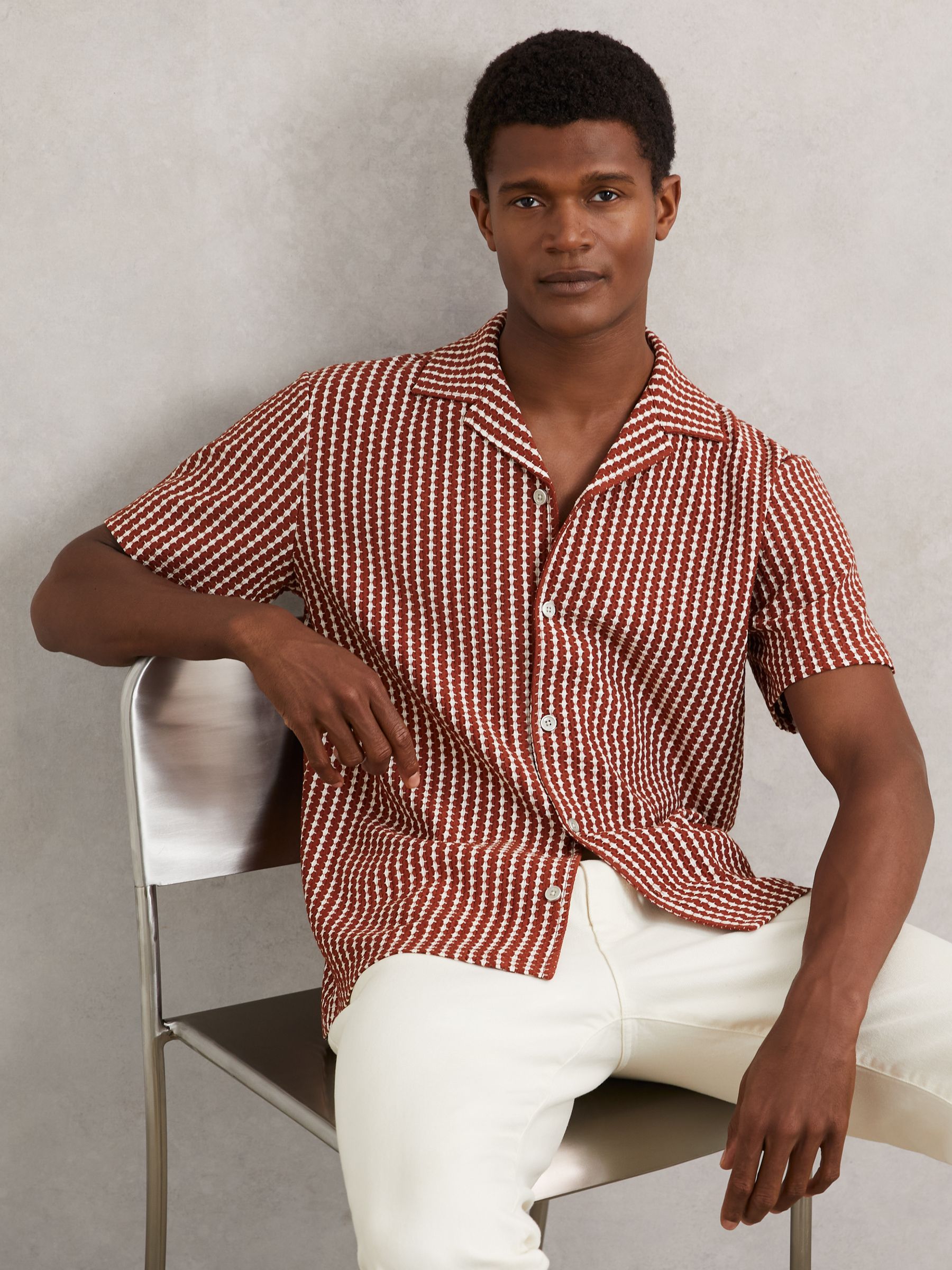 Textured-Stripe Cuban-Collar Shirt in Rust Red/White