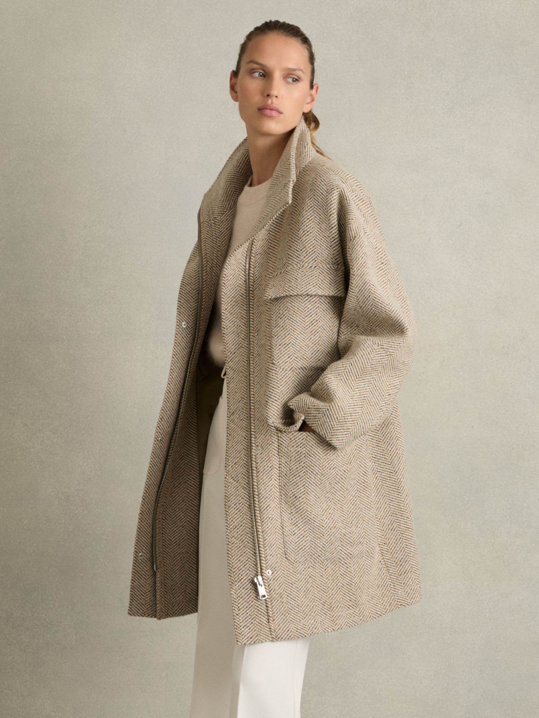 Funnel-Neck Herringbone Coat With Wool in Neutral