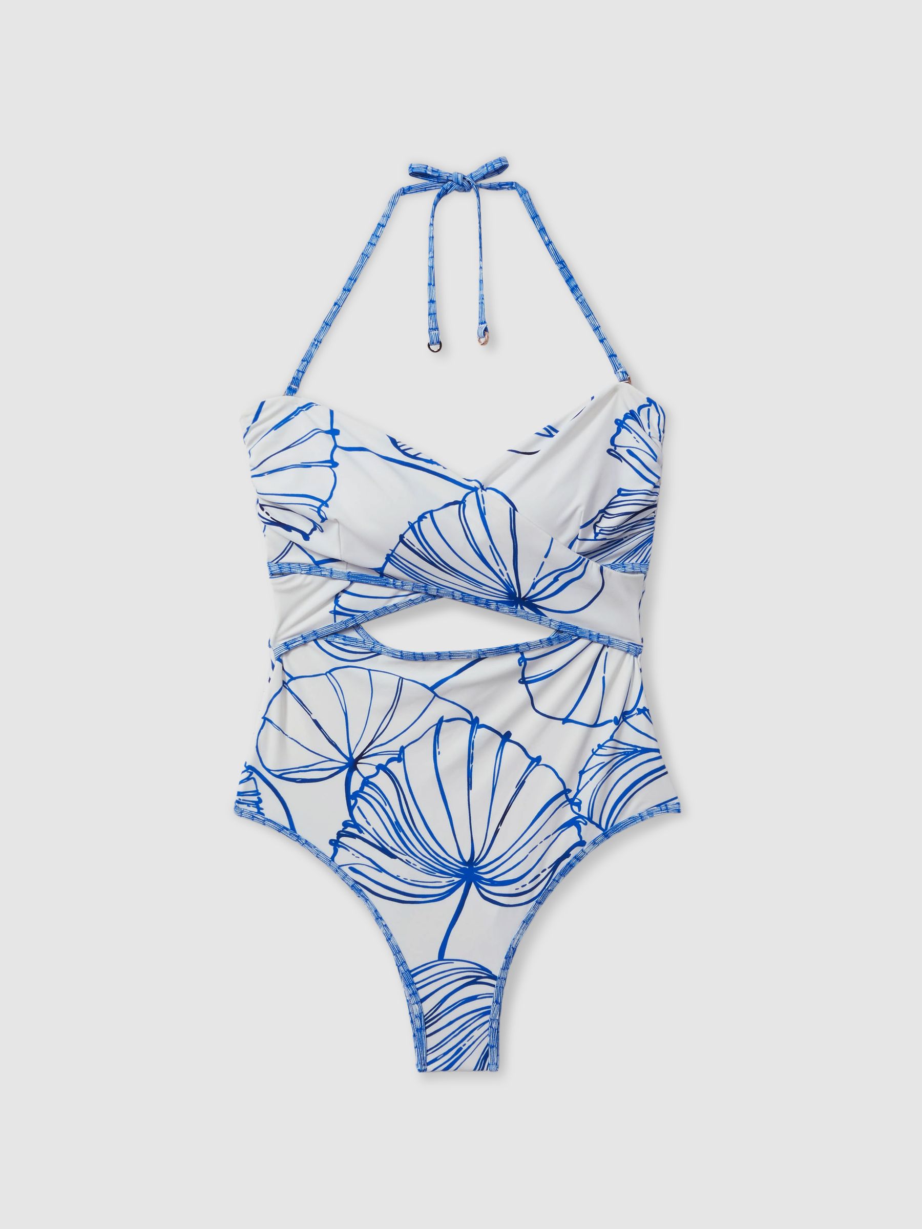 The Veronica swimsuit is detailed in a leaf print with a removable halter neck fastening. The bust is curated with wrap-over panels that showcase a subtle cut-out detail to the chest. Leaf print Removable self-tie halter neckline Wrap design Cut-out detail to the chest Boning Framilon edging Tie fastening to reverse The model is wearing a size 8. Measurements of model: 5ft 9'' / 175cm.