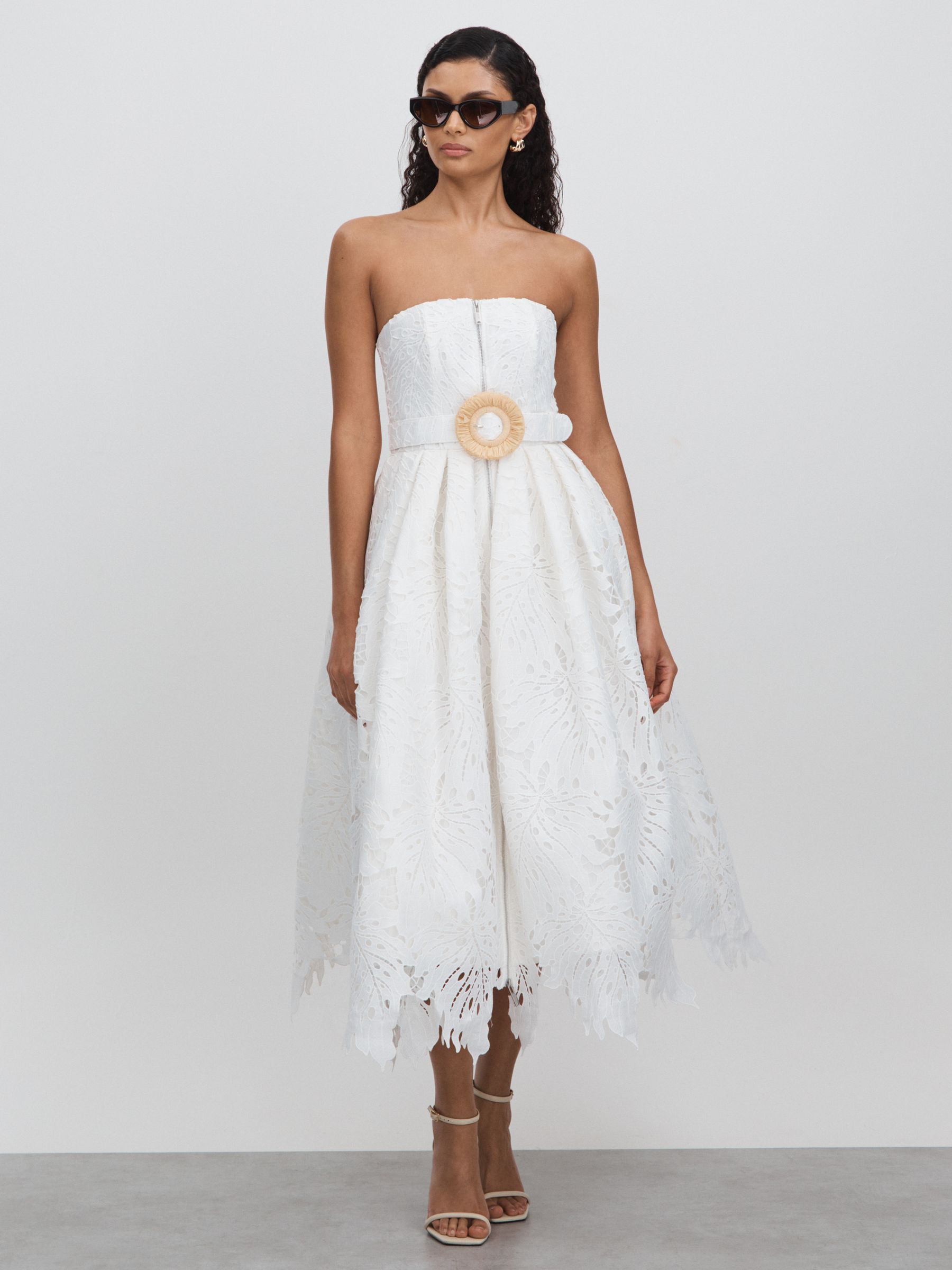 Leo Lin Strapless Lace Belted Midi Dress in Snow White