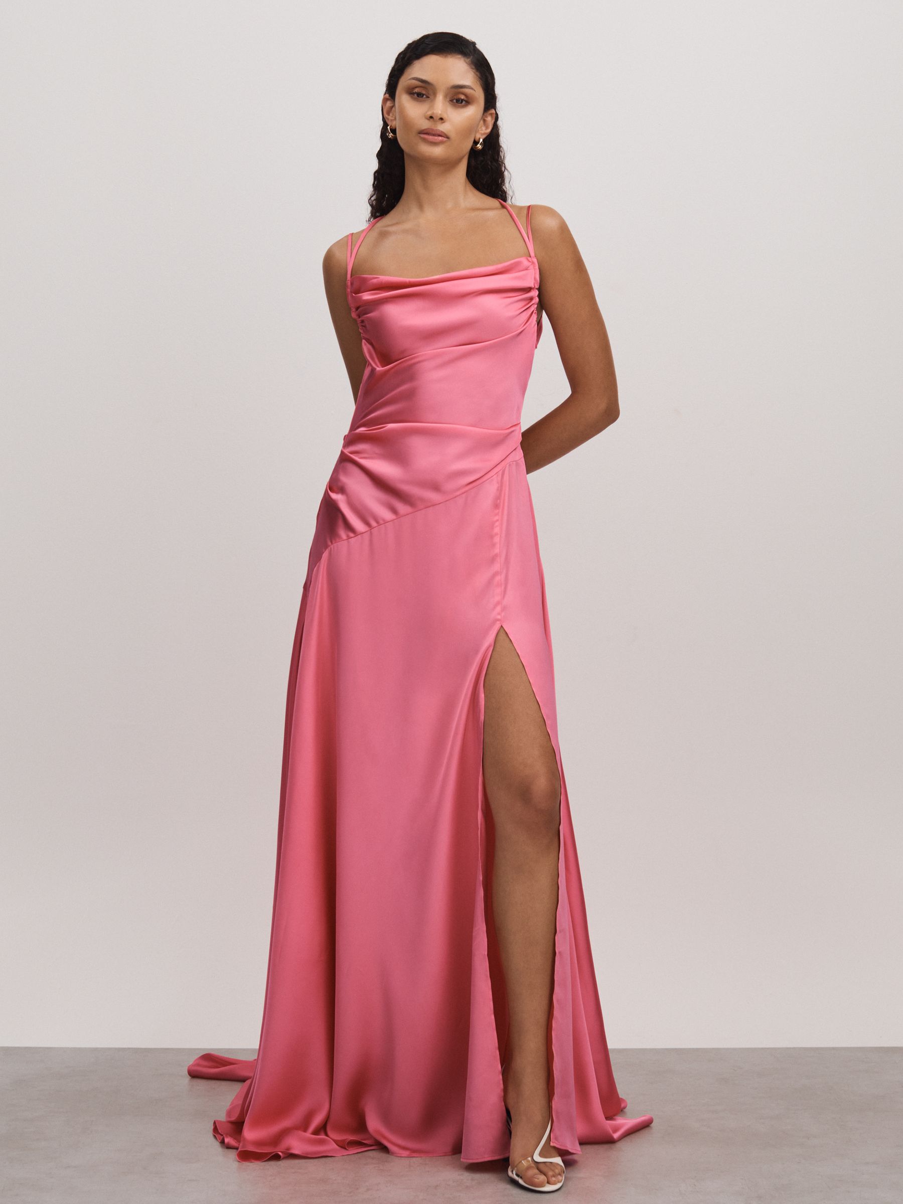 Leo Lin Watermelon Leo Lin Ruched Cowl Neck Satin Maxi Dress