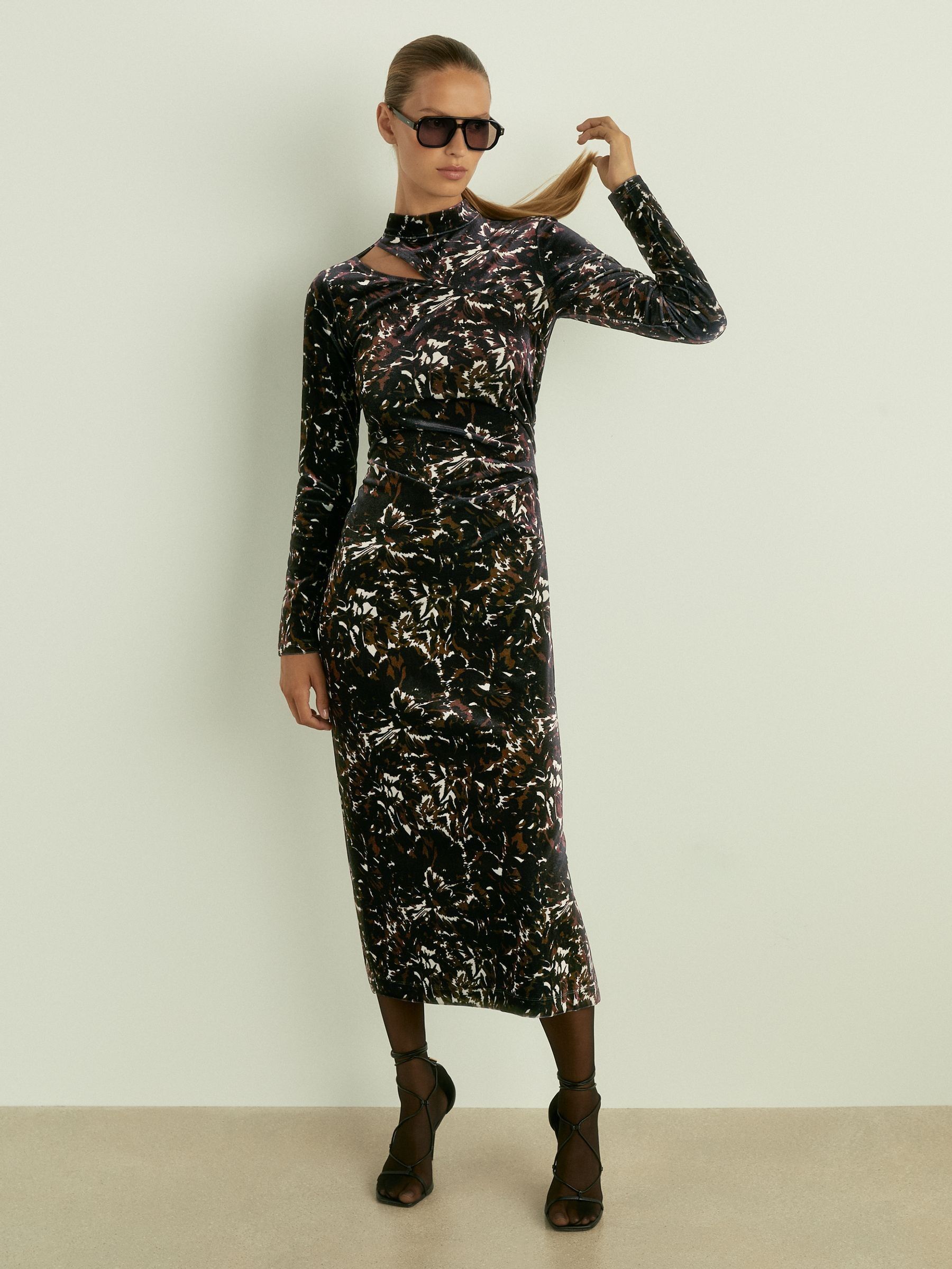 Cut Out Abstract Print Velvet Dress in Black