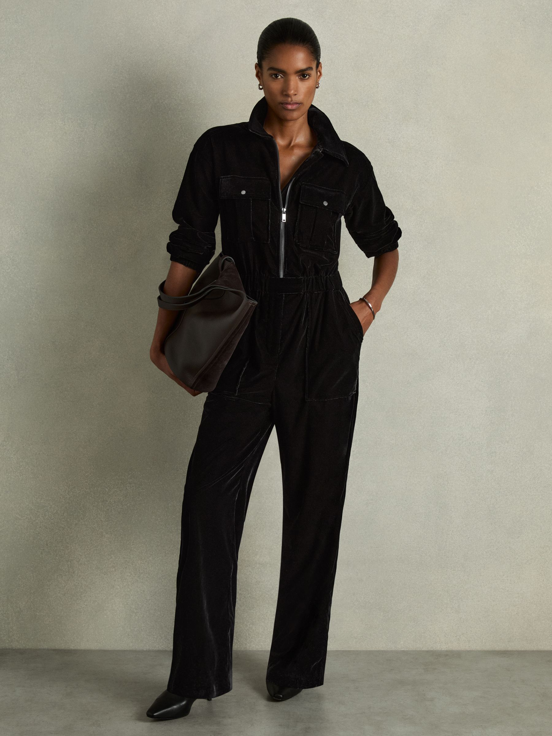 Patch-Pocket Velvet Jumpsuit in Black