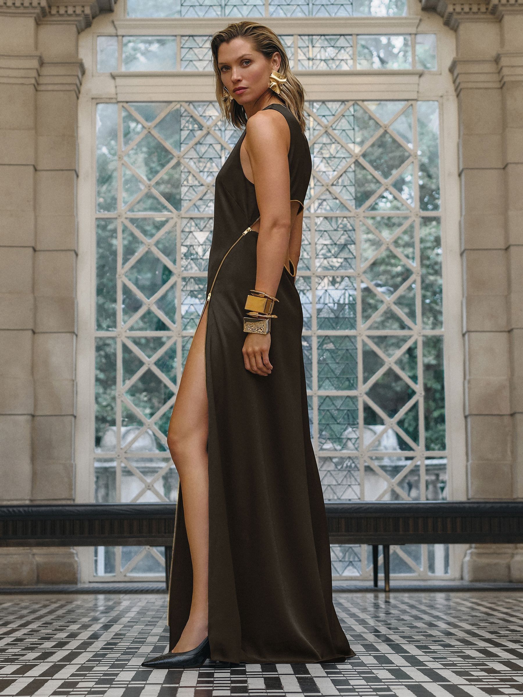 Atelier Zipped Satin Maxi Dress with Virgin Wool in Chocolate