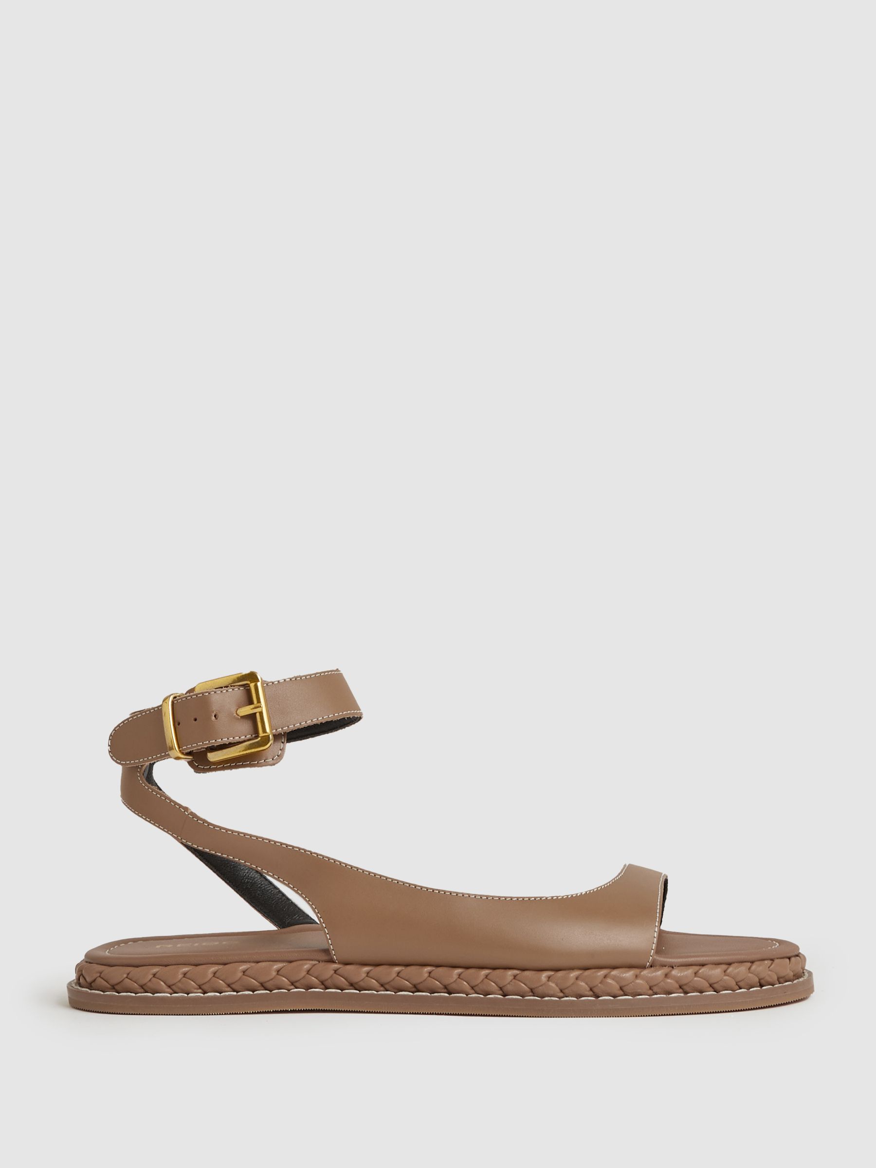 Suede Buckle-Strap Slip-On Sandals in Tan