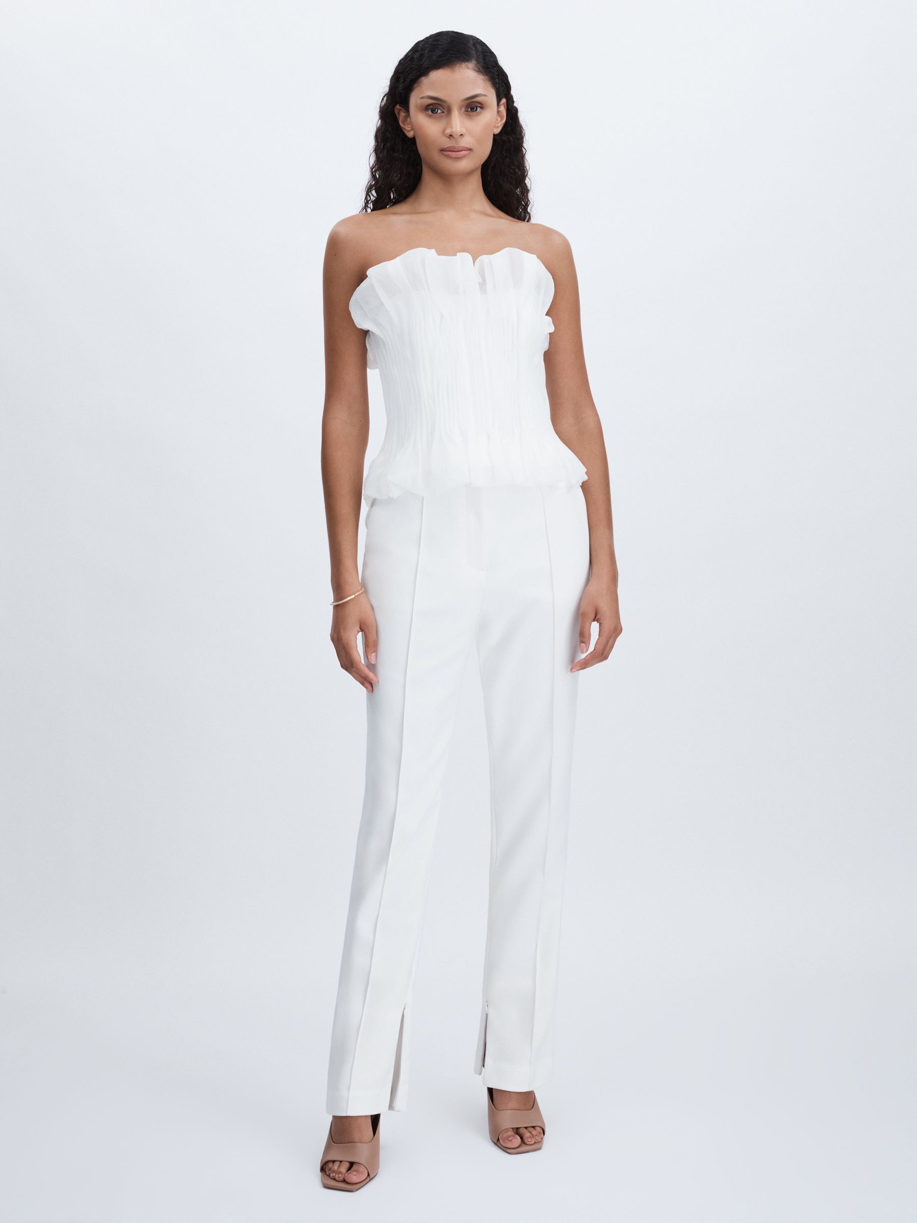 The Clements top is a unique and elegant style crafted from organza. Pintucks at the waist create structured frills around the hem and neckline, whilst a fitted bodice with boning provides internal support. An exposed metal zip at the back finishes with a modern edge. Organza Strapless with internal grippy tape Pintucks with structured frills Boned internal bodice Exposed zip to reverseAcler, curated by Reiss, is a selection of women’s occasionwear that bridges the gap between modern tastes and couture techniques.