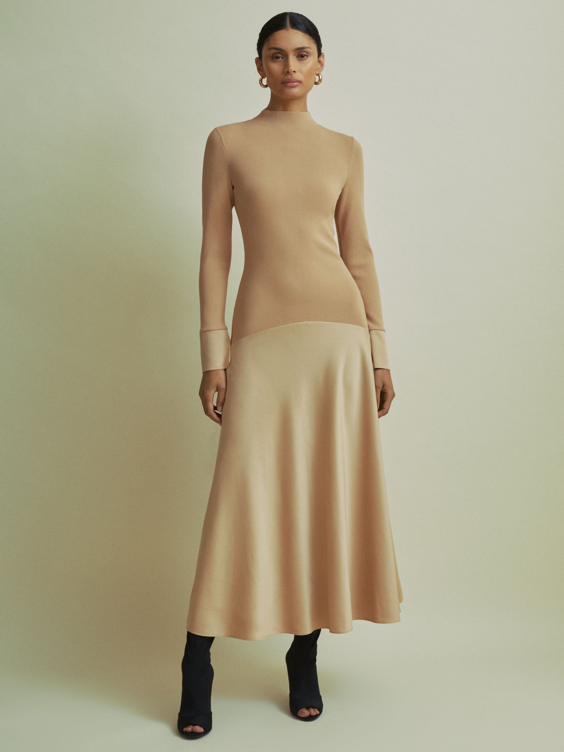Florere Hybrid Knit-Satin Midi Dress in Sand