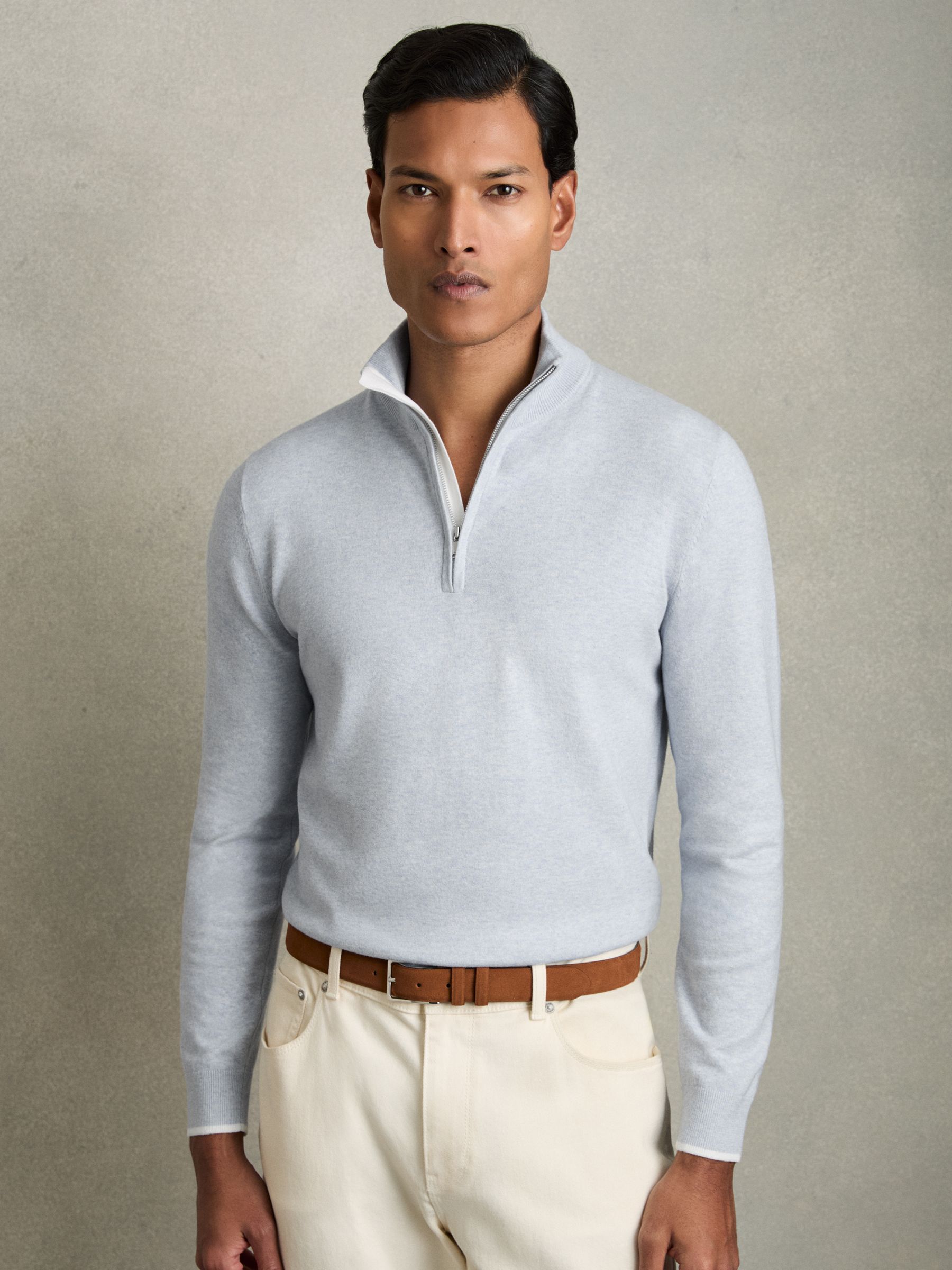 Cotton-Blend Half-Zip Jumper in Soft Blue