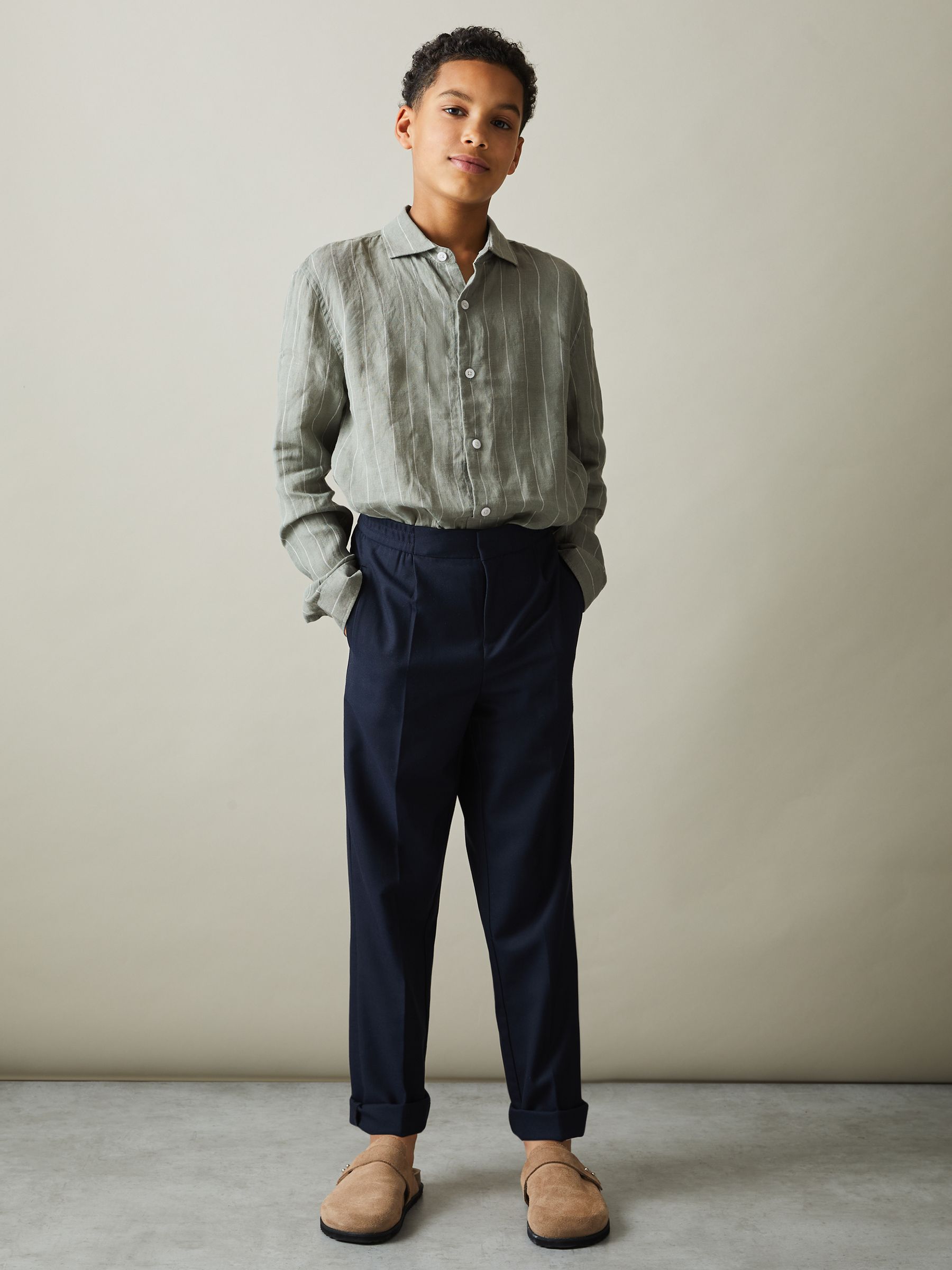3-9 yrs Striped Linen Cutaway Collar Shirt in Sage Stripe