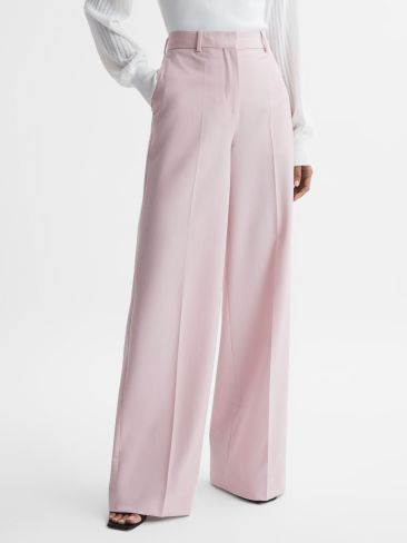 Luxe wool yarns are cut into a mid-rise, wide-leg shape for the pink Evelyn trousers. The front of these formal trousers is subtly pressed for a refined edge, perfect for 9-5 wear. Wool blend Mid-rise Side-slip pockets Pressed-front creases Wide leg The model is wearing a size 8. Measurements of model: Height 5ft 9'' / 175cm.