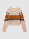 The Miri jumper is designed in a colour block palette and a striped arrangement. Its thick knitted construction is enhanced with wool and mohair for warmth and comfort, and enhanced with raglan sleeves. Made with wool and mohair Colourblock striped design Crew neckline Raglan sleeves Ribbed trims