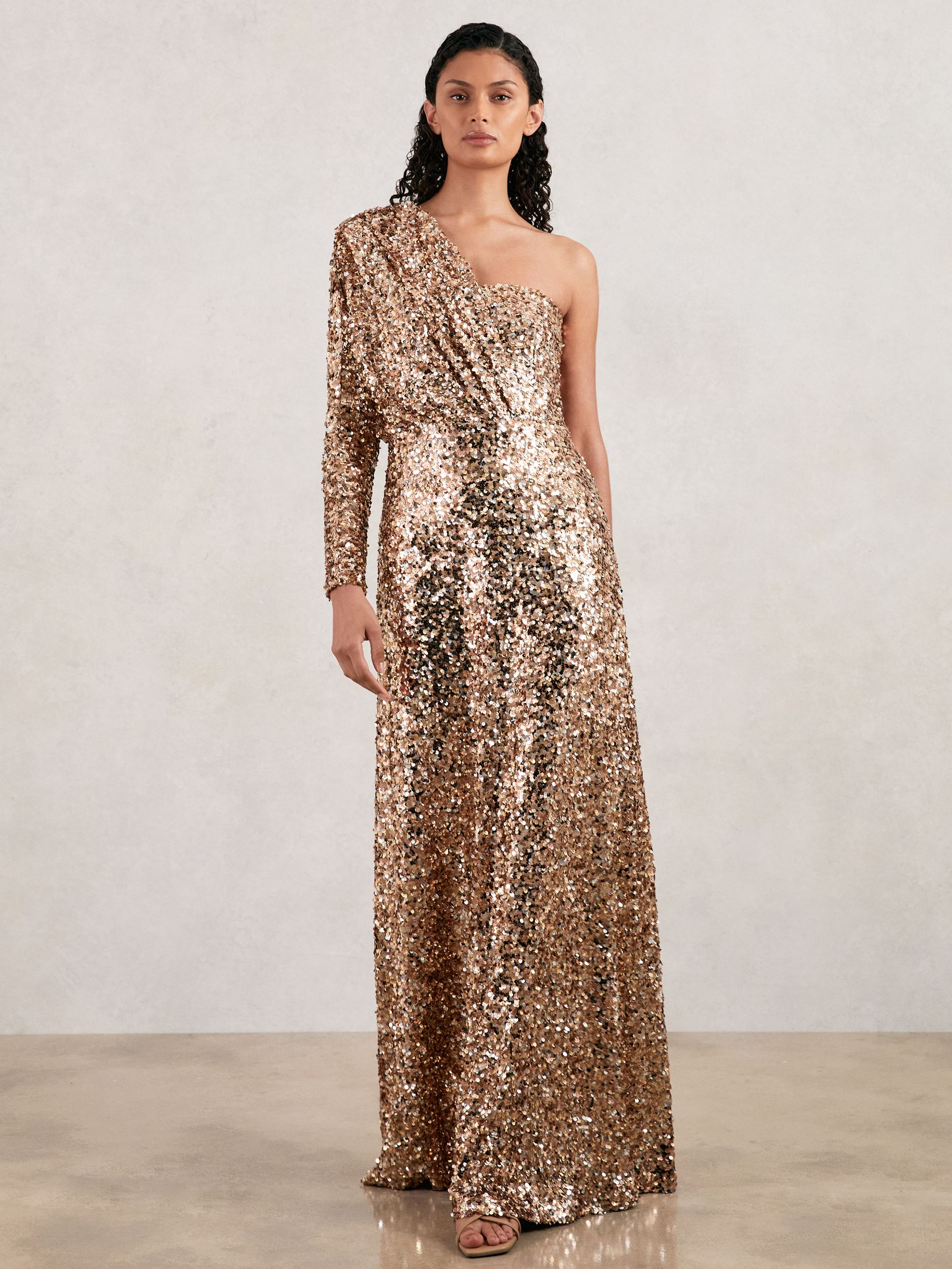 Halston Sequin One Shoulder Maxi Dress in Gold