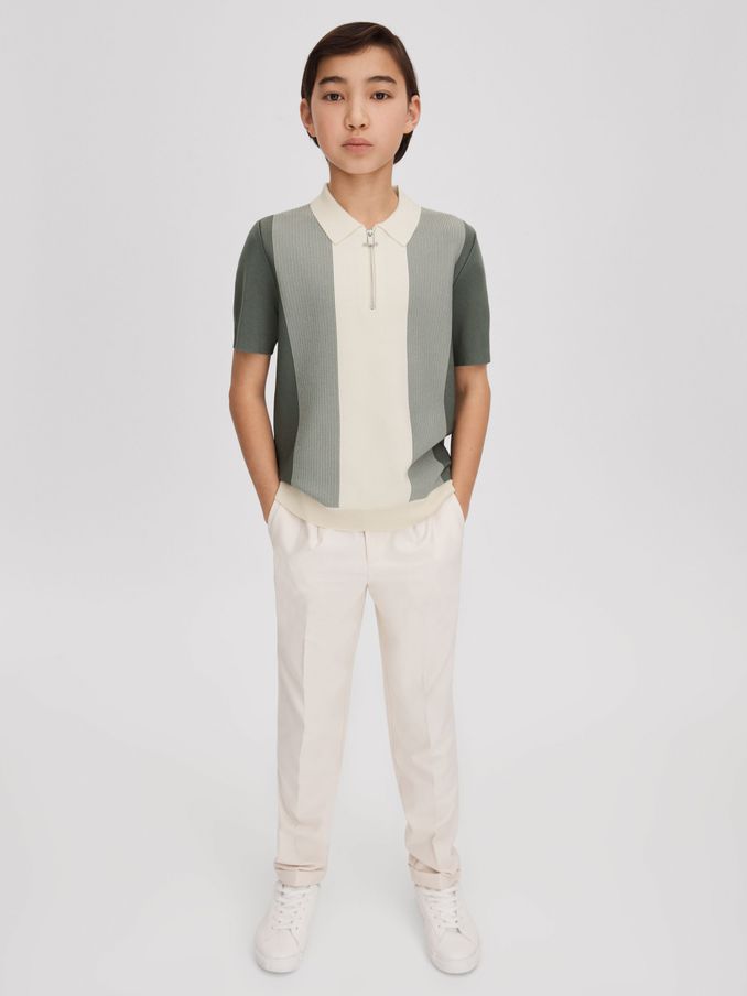 3-9 yrs Cotton Stripe Knit Half-Zip Polo Shirt in Sage Green/Off White