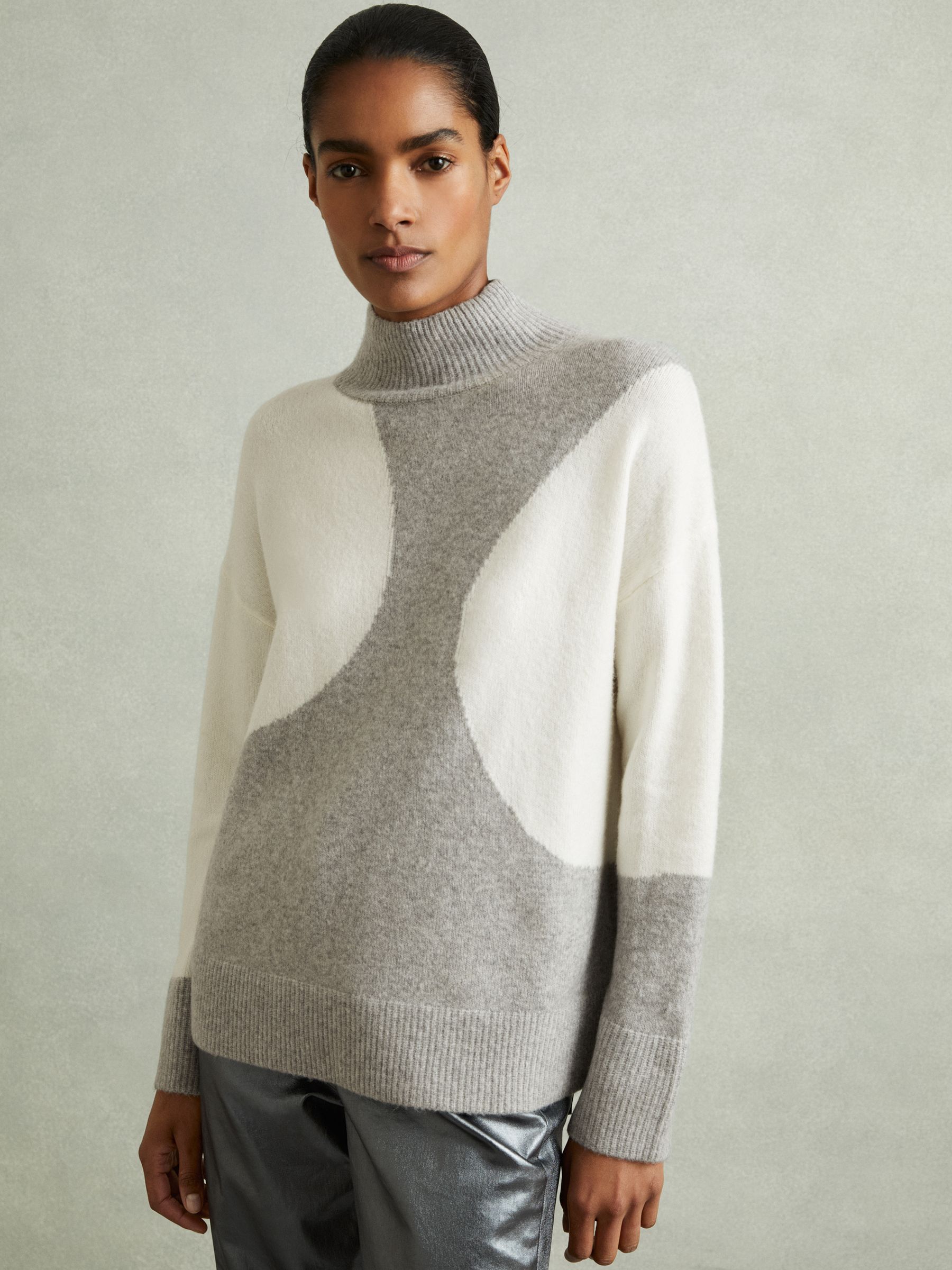 Colourblock Roll Neck Jumper in Ivory/Grey