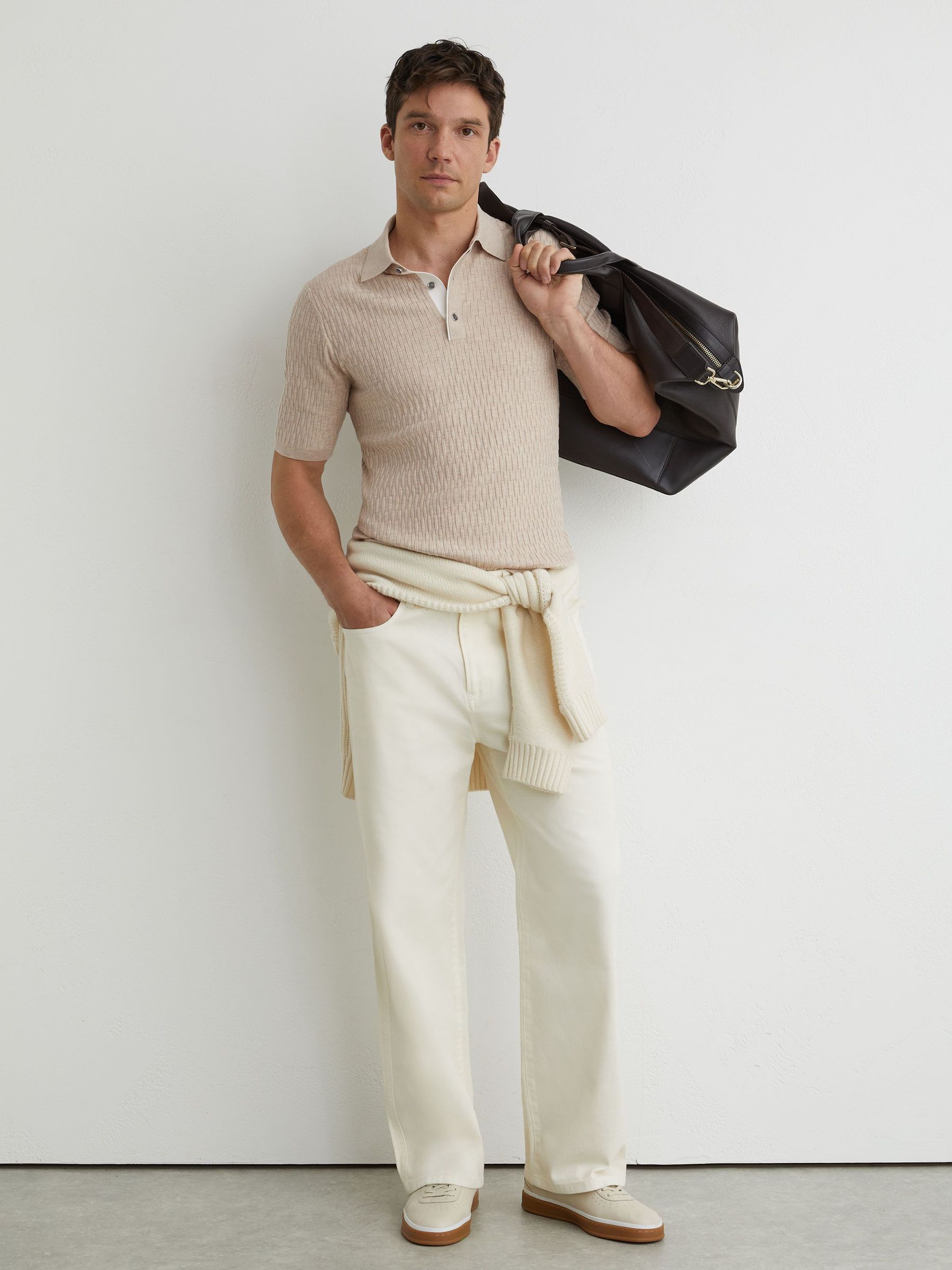 Open-Collar Textured-Knit Polo Shirt in Soft Grey