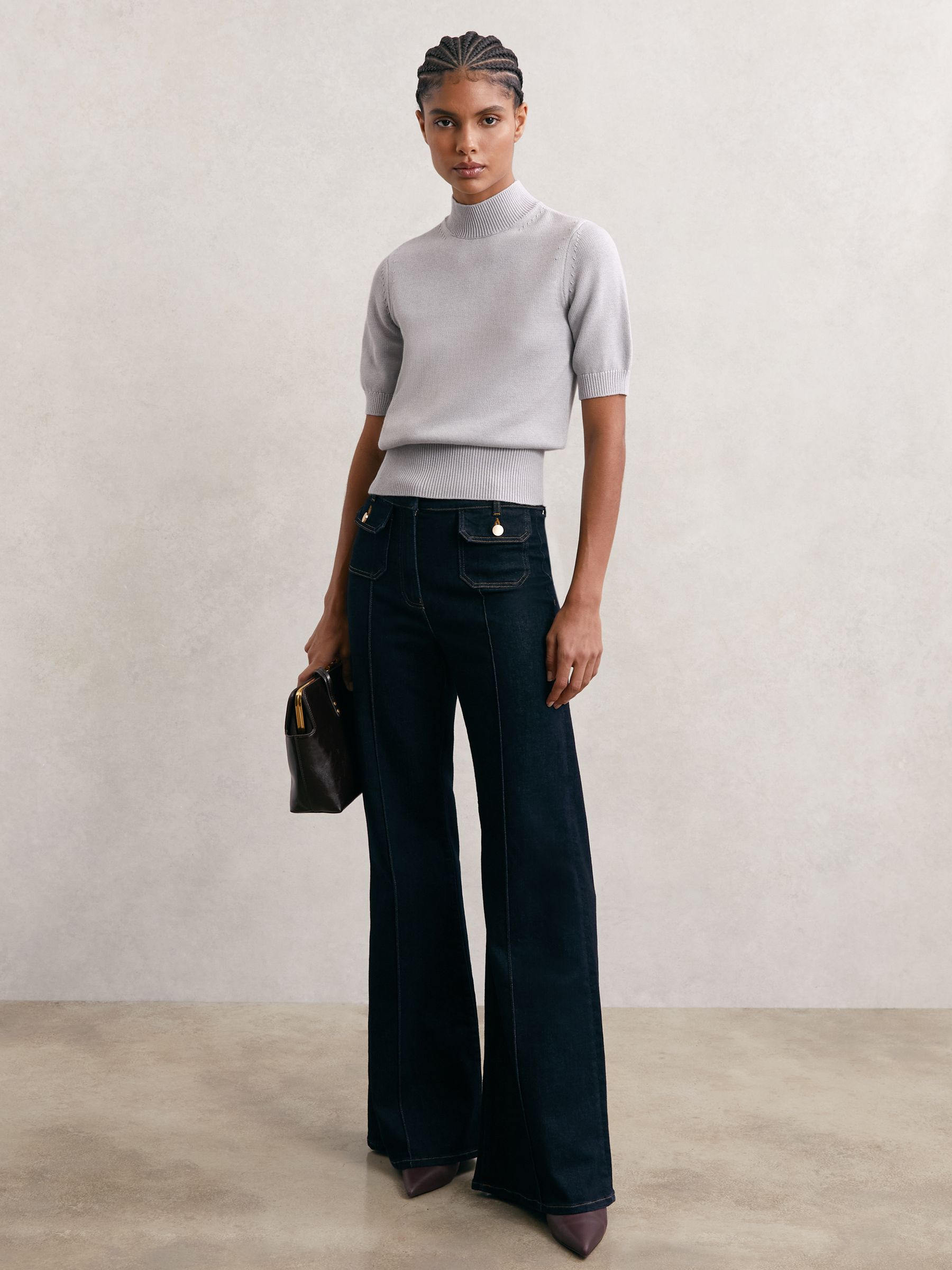 Cotton and Wool Funnel-Neck Knit Top in Grey