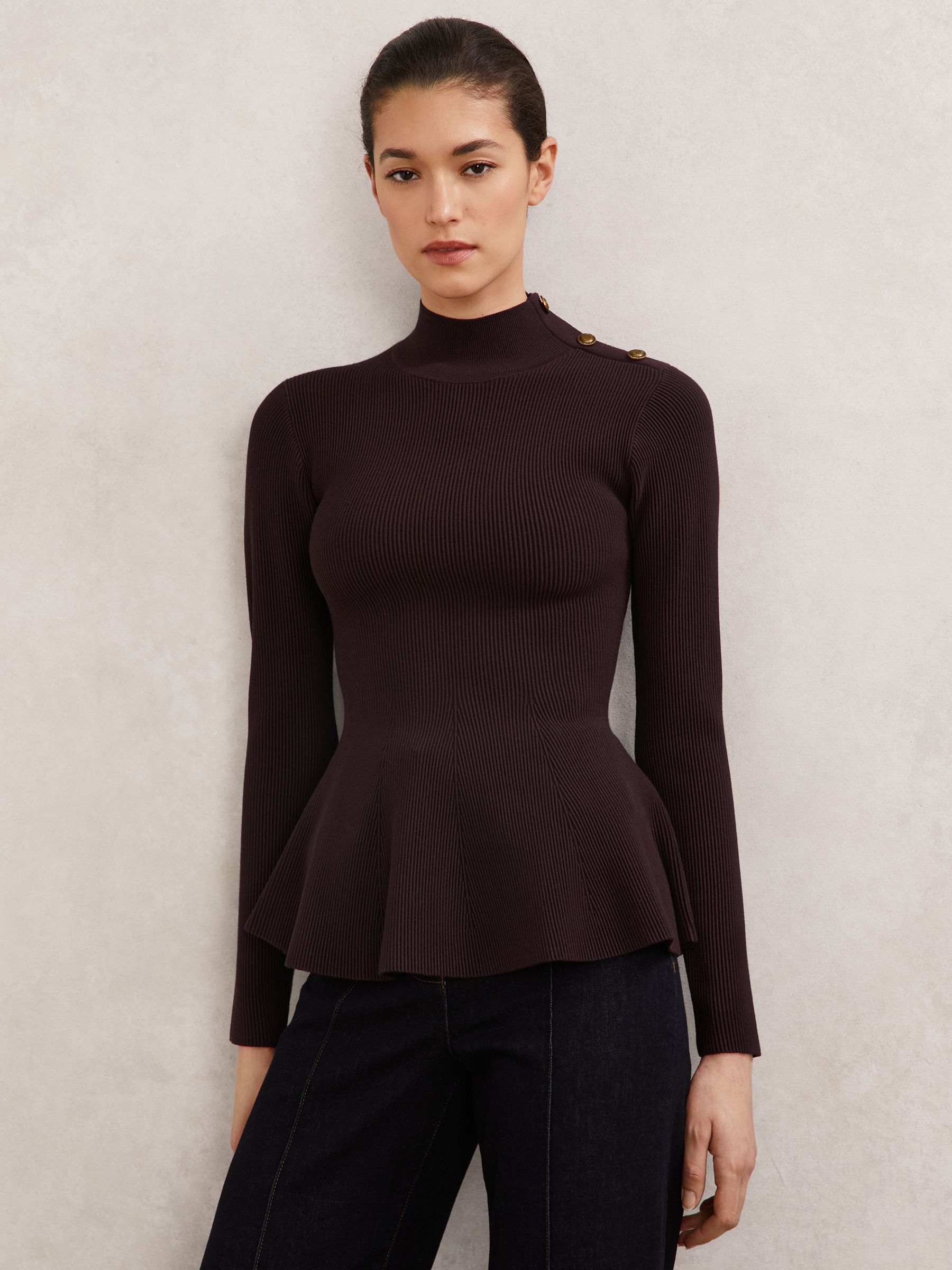 Rib-Knit High-Neck Peplum Top in Burgundy
