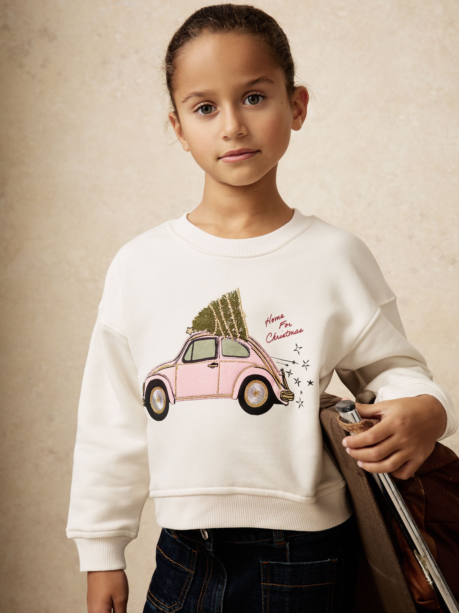 3-9 yrs Festive Car-Embroidered Sweatshirt in Ivory