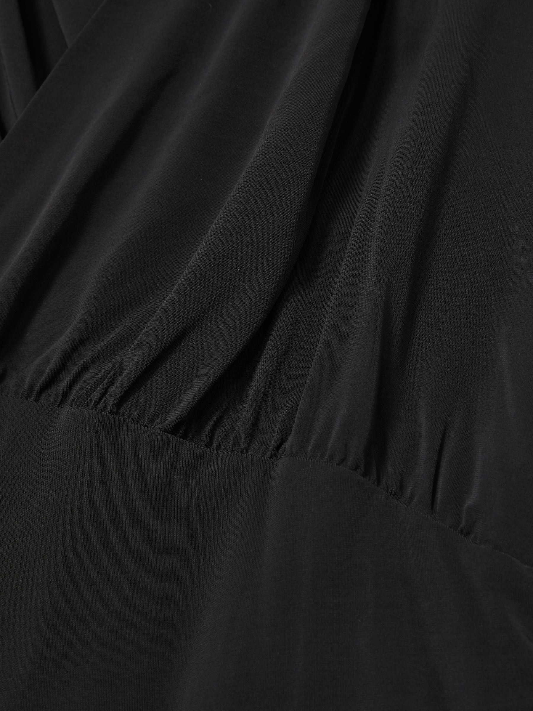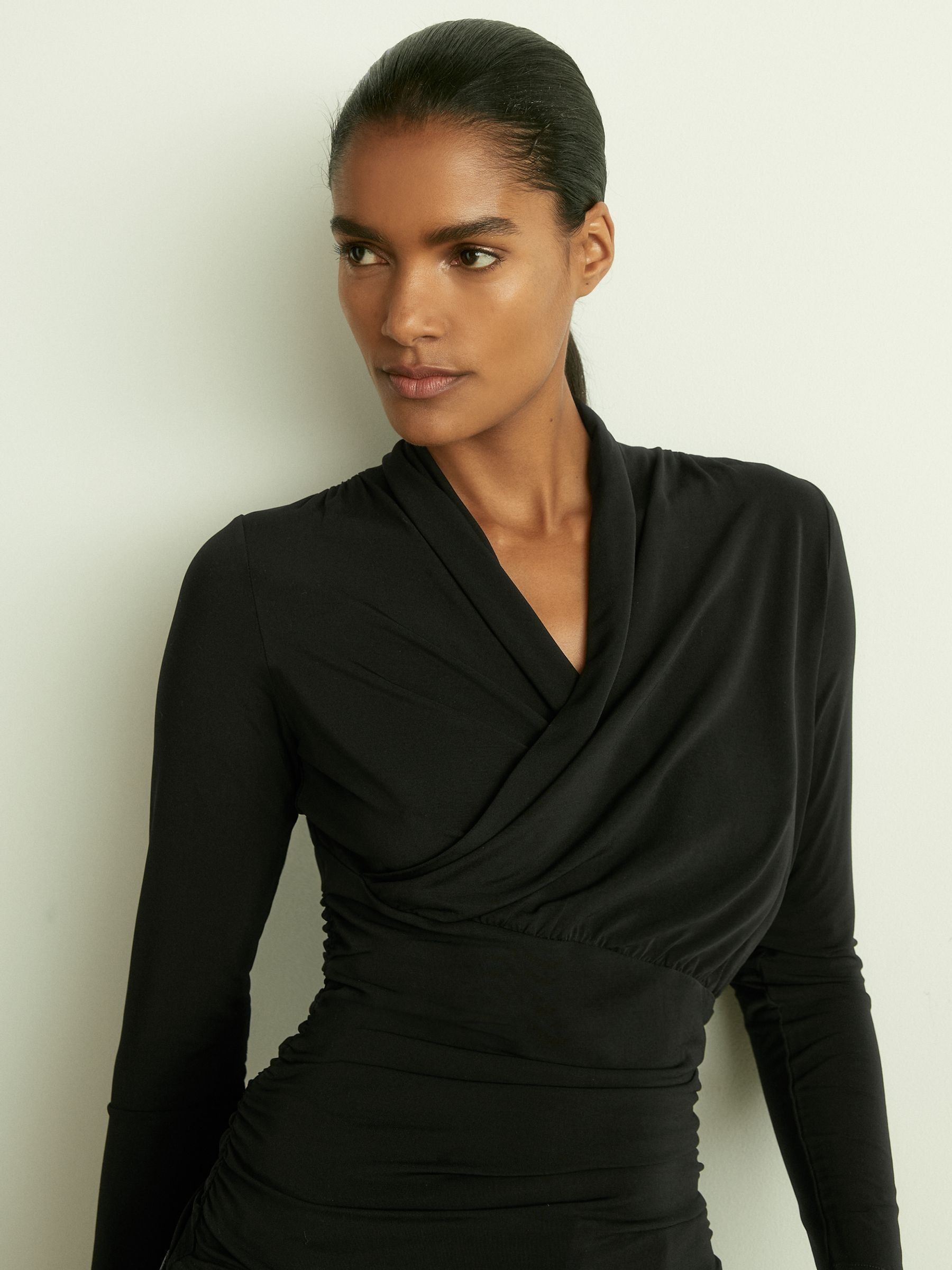 The wrap-style V-neck of the Peyton mesh top creates fluid draping around the bust. Ruching at the sides creates an elegant, rippled effect. Mesh stretch Wrap V-neckline Ruching The model is wearing a size S. Measurements of model: Height 5ft 10'' / 177.8cm.
