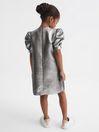 The Ellie is the ideal dress for special occasions, crafted with metallic silver fibres and puff sleeve detailing for a look that is sure to turn heads. Crew neckline. Puff sleeve detail. Metallic fabrication. Zip closure to reverse. Above-knee length. Modern fit. The model is wearing a size 5-6 yrs.