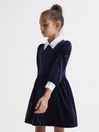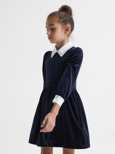 6.12.1 Junior Diamante Collar Velvet Dress in Navy - REISS Click here to use our website with more accessibility support, for example screen readers