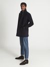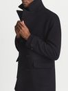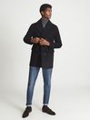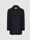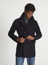 Embrace ageless style with the Cork peacoat, shaded in versatile navy. It s crafted from a warming wool blend with a double-breasted front button close and large lapels, then is lined in satin for smooth winter layering. Wear it with knitwear and trousers for effortless cool-weather appeal. Large peak lapels. Four pockets. Button cuffs. Double-breasted button close .
