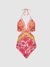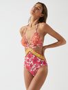 The Hannah swimsuit in coral imparts a feminine mood, ideal for trips to the beach or pool this summer. It s designed as an all-in-one style with a halterneck and cut-out sides which extend, giving a two-piece look from the reverse. It features lattice detailing and comes in a desirable floral print. Wear with sunglasses and a sun hat for resort-chic. This garment contains Lycra Xtra Life fibre. It resists fit loss and fibre breakage caused by pool water, giving you long-lasting fit and shape. Halterneck Dual self-ties to reverse. Triangle cups. Lattice detailing. Floral print. Medium coverage. The model is wearing a size 8. Measurements of model: Height 5ft 10 / 178cm, Chest 32" / 81 cm, Waist 24" / 61cm.