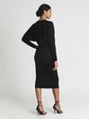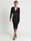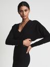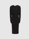 The ruched sleeves of the Jenna dress add a sense of fluidity to the silhouette. It is is crafted from a sumptuous wool and cashmere-rich blend for softness and warmth in the cooler months, then is topped with a deep-cut V-neckline. This design fits casually on top, then hugs the frame around the hips and thighs for a flattering wear. V-neckline. Long sleeves. Ruching detail. Midi length.