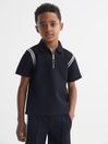 A classic polo silhouette gets a fresh update with the navy Monarch shirt. It’s fitted with a half-zip neckline and stripe detailing is added for an understated style. Pair with the coordinating shorts for a refined look with a sportive edge. Half-zip polo neckline Short sleeves Stripe detailing The model is wearing a size 5-6 yrs Measurements of model: Height 3ft 9" / 121cm