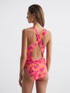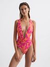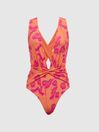 The printed Beatrix swimsuit is cut in a high-leg silhouette with a deep-plunge neckline for ultimate allure. A twist detail is featured around the waist to accentuate the natural frame. It’s finished with crossed straps to the reverse. Pair with bold sunglasses for a striking poolside look. Plunge neckline. Non-padded cups. High leg. Twist detail to waist. Crossed back straps. The model is wearing a size 8.