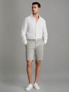 Cut from a cotton-stretch blend into a modern fit, the soft sage Wicket chino shorts finish above the knee. Cotton-stretch blend. Side-slip pockets. Buttoned pockets to reverse. Modern fit. The model is wearing a size 32. Measurements of model: 6ft 2'' / 188cm.