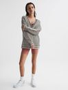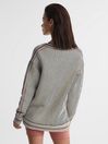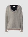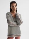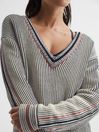 The Upside, curated by Reiss, is a dynamic collection of women’s athleisurewear crafted to transform your workout wardrobe. Think design-led, supportive styles engineered to work as hard as you. The navy ribbed Louie knit sweater is spun from 100% cotton for lightweight breathability, ideal for throwing on before and after a workout. It’s fitted with a deep V-neckline and designed with striped trims. Complete the look with leggings and your favourite Reiss trainers. Deep V-neckline. Striped trims. Long sleeves. Ribbed fabrication. 100% cotton. The model is wearing a size S. Measurements of model: Height 5ft 9" / 176cm.