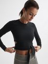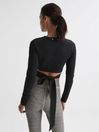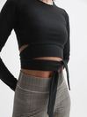 The Upside, curated by Reiss, is a dynamic collection of women’s athleisurewear crafted to transform your workout wardrobe. Think design-led, supportive styles engineered to work as hard as you. The black Lucy top is cut in a slim-fit silhouette and features a wrap design that ties around the waist for a secure, customisable wear. Cut-out detailing and a cropped finish lend controlled sensuality to this workout wear essential. The brand’s signature arrow logo is featured to the neck to elevate the style. Wear with high-rise leggings to complete the look. Crew neckline Cut-out detail to reverse Long sleeves Wrap design Tie to waist Arrow logo to reverse Cropped Slim fit The model is wearing a size S Measurements of model: Height 5ft 9" / 176cm.