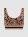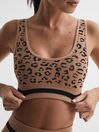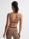 The Upside, curated by Reiss, is a dynamic collection of women’s athleisurewear crafted to transform your workout wardrobe. Think design-led, supportive styles engineered to work as hard as you. Give your activewear drawer a playful update with the Zanzi Daisy sports bra. It’s crafted from a ribbed fabrication in a bold leopard print and features the brand’s signature arrow logo for enduring style. A thick striped under band lends support throughout your workout. Compliment the look with the coordinating shorts. Scoop neckline. Striped waistband. Ribbed fabrication. Arrow logo to reverse. Removable padding. Leopard print. Slim fit.