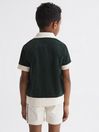 Refine his wardrobe with the textured Vine shirt. It’s a green and ecru colourblock design, fitted with a Cuban collar for smart appeal. Keep a casual sensibility by choosing drawstring shorts, or elevate the mood with chinos. Textured fabrication. Colourblock design. Cuban collar. Button front closure. Short sleeves.