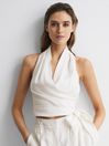 Confident styling calls for the Hollie cropped top. Crafted from a crisp linen blend in a timeless white shade, this piece is set to become your style hero for occasions to come. It’s a halter neck design which hugs the frame and secures with a self-tie element. Pair with high-rise separates to complement the profile. Open-back design. Halter neckline. Sleeveless. Self-tie fastening. Linen blend. Cropped. The model is wearing a size 8 Measurements of model: Height 5ft 10" / 178cm.