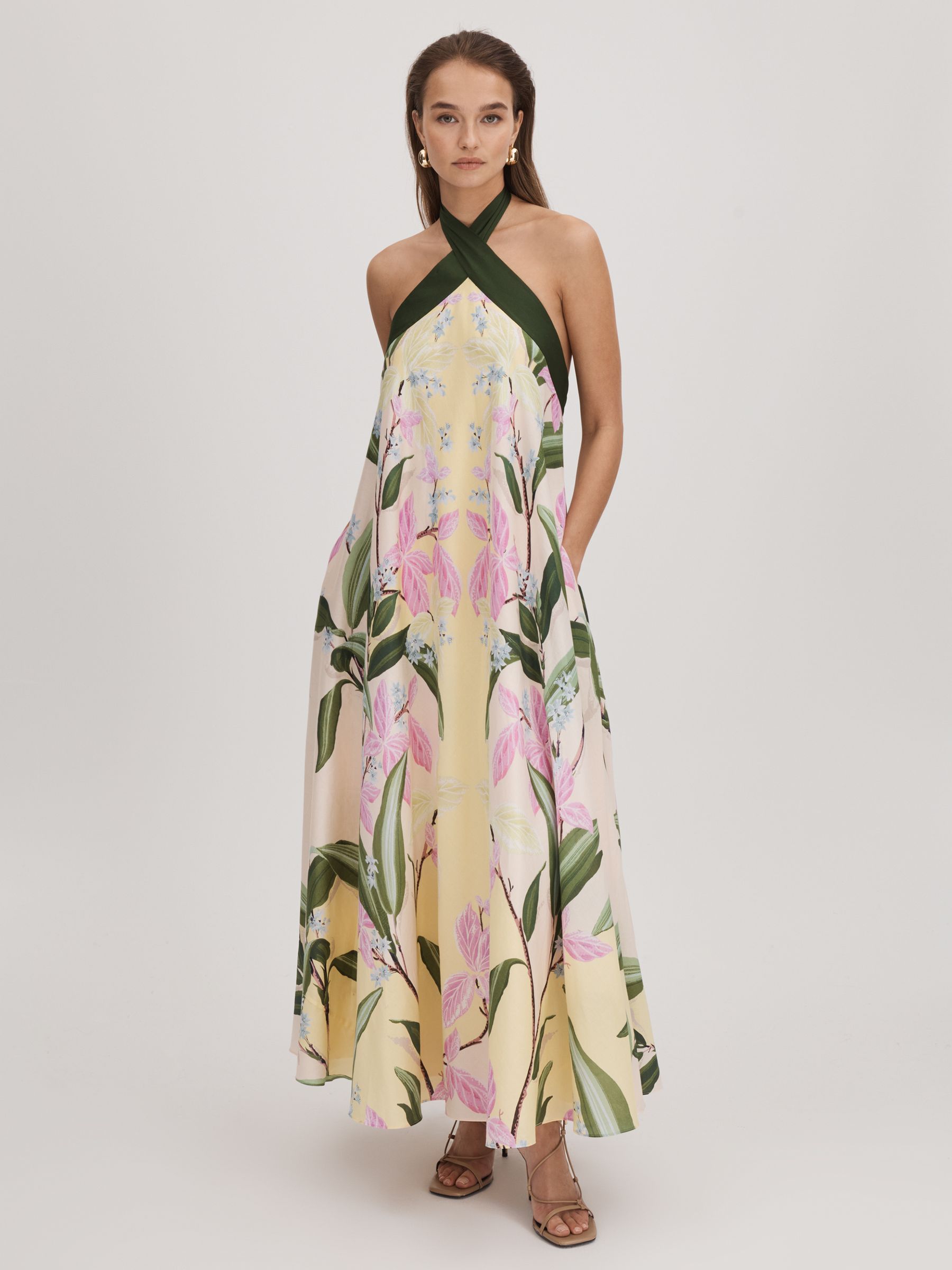 Florere Printed Halterneck Midi Dress in Pale Yellow