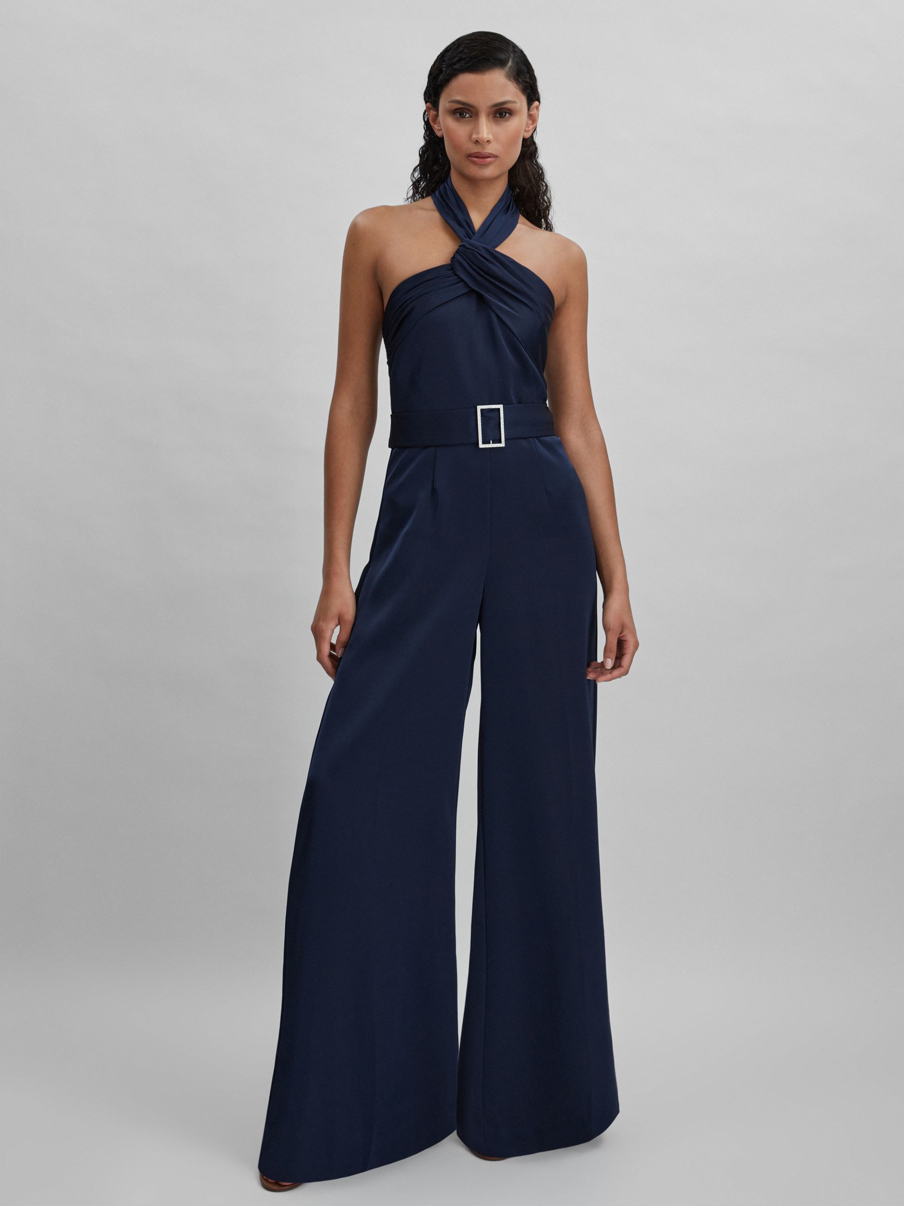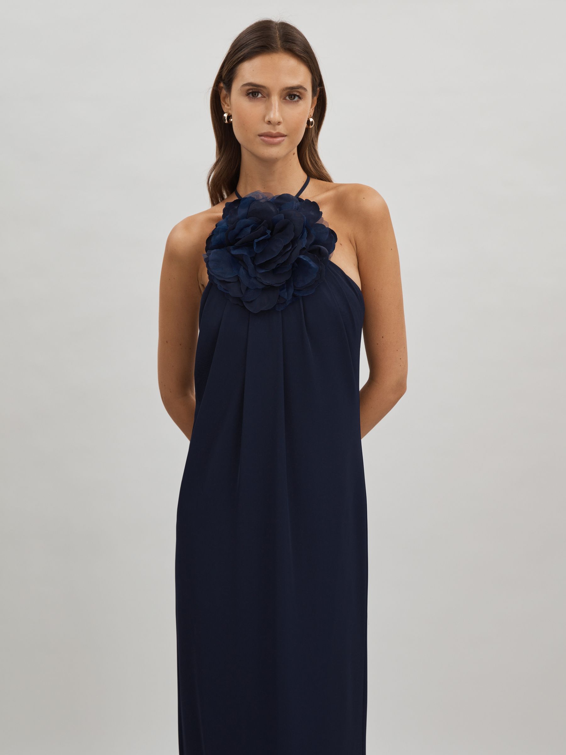 Gemi Navy Halston Satin Halter Neck Maxi Dress