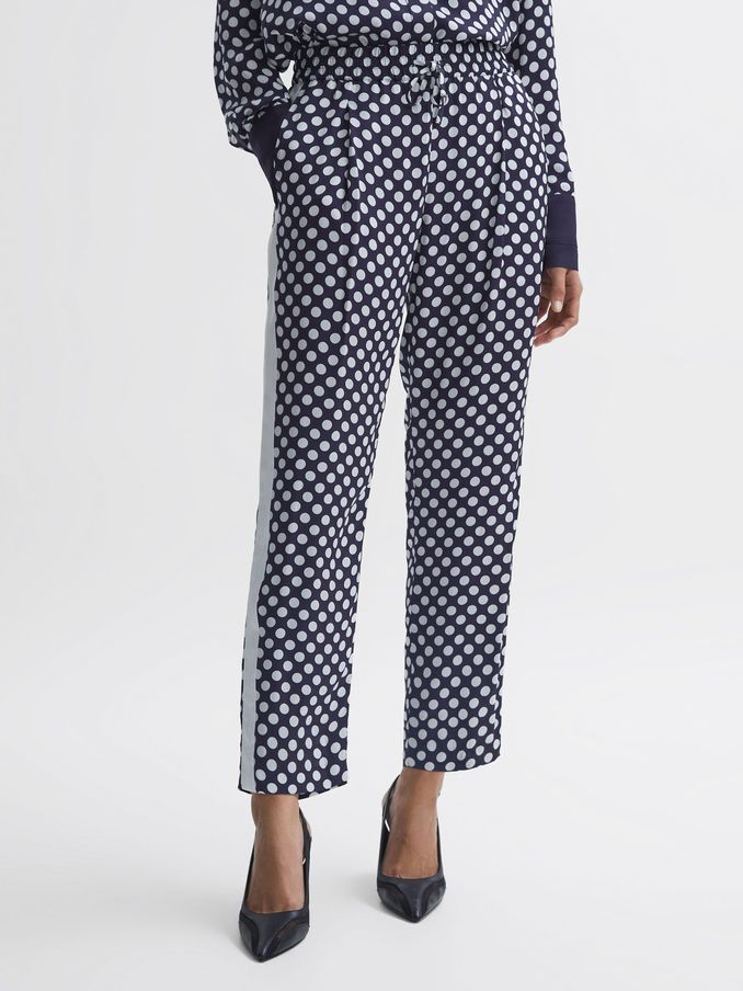 Petite Polka Dot Drawstring Tapered Trousers in Navy/White