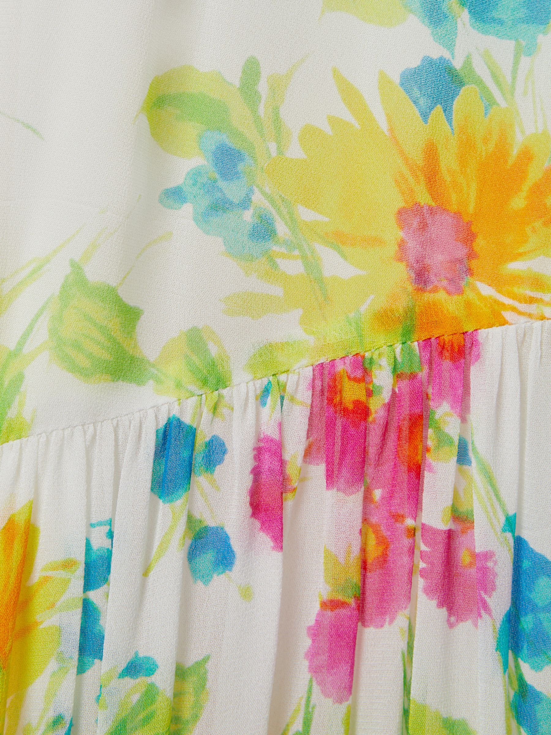 This relaxed midi dress is cut from a sheer fabric with a removable slip dress underneath. The neckline fastens with a tie element and blouson sleeves are added. Florere's Pop Floral print is inspired by hand-painted vintage artwork, encompassing heritage details whilst characterising a modern feel. Tie neck Blouson sleeves Removable slip dress Relaxed fit Midi length Florere, curated by Reiss, is a new brand for women that celebrates the boldly feminine, creating timeless and eye-catching pieces from vintage archives and then reimagining them in vibrant colourways and fluid fits. The model is wearing a size 8. Measurements of the model: 5ft 8''/ 173cm. Regular side neck to hem 51" / 130cm.