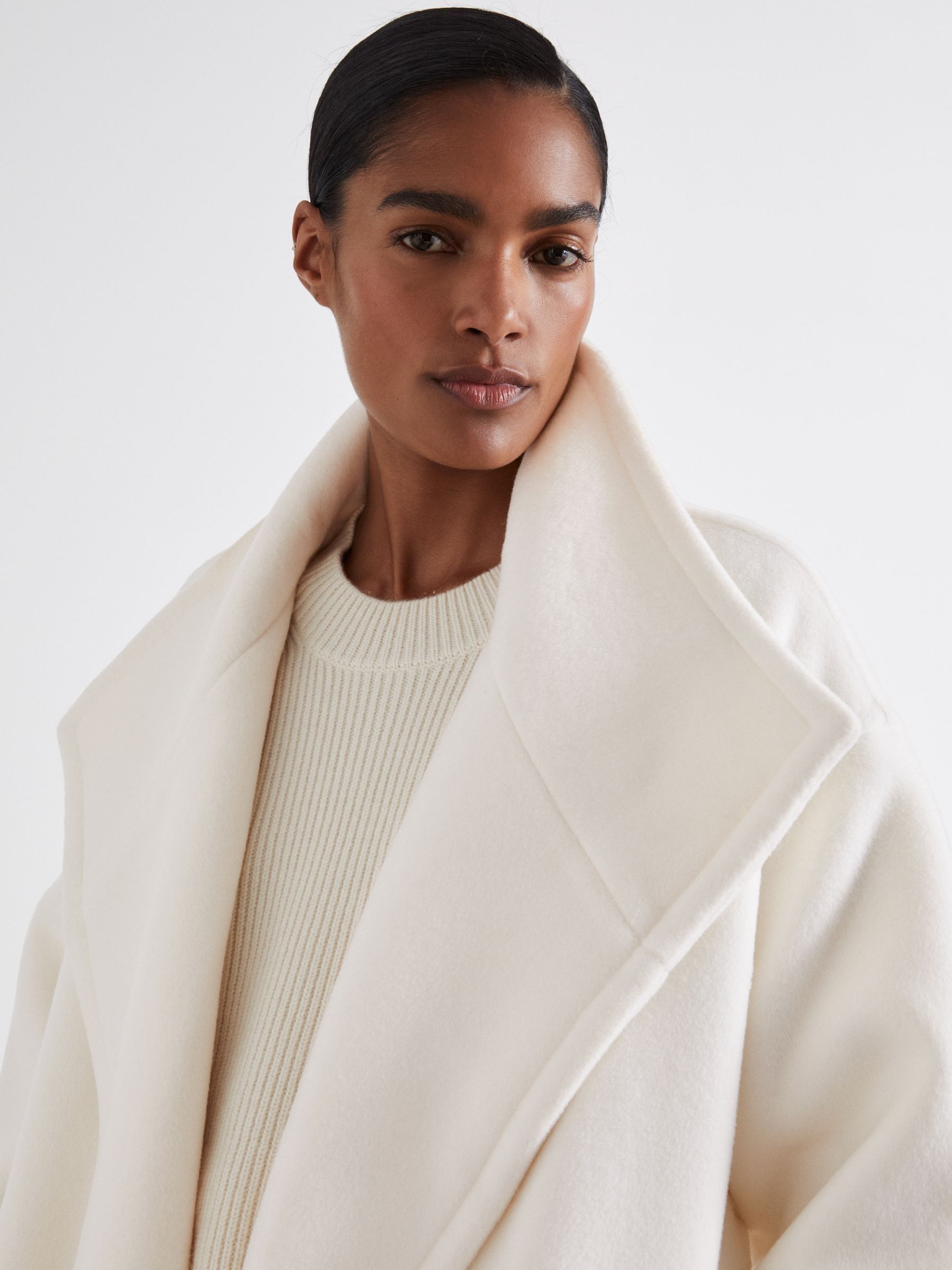 Crafted from a double-faced blend of wool and cashmere for supreme softness, the Cream Evelyn coat is meticulously blind seamed for a clean-lined finish. It’s shaped with an exaggerated collar, adjustable latched cuffs and belted waist. This blindseam coat is crafted using double-faced, splittable wool for a supremely soft interior that matches the exterior, removing the need for a lining. Reiss Atelier is an effortlessly chic collection of timeless wardrobe staples and occasion pieces that can be worn - and loved - for many years. Wool-Cashmere blend Exaggerated collar Latched cuffs Inseam pockets Belted waist The model is wearing a size 8.Measurements of model: Height 5ft 10'' / 177.8cm. Regular centre back neck to hem 46" / 117cm.