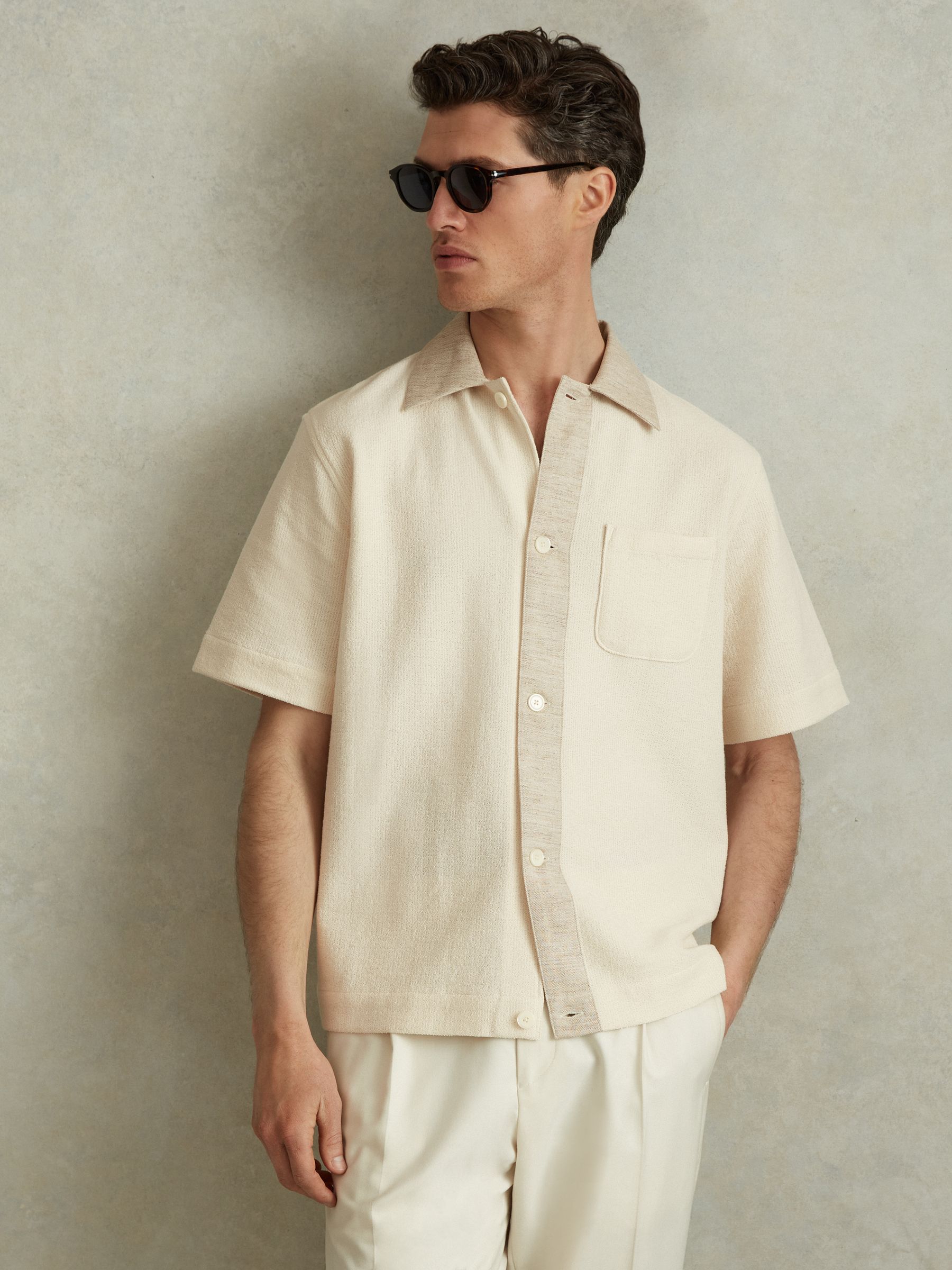 Textured Cotton Blend Contrast Shirt in Ecru