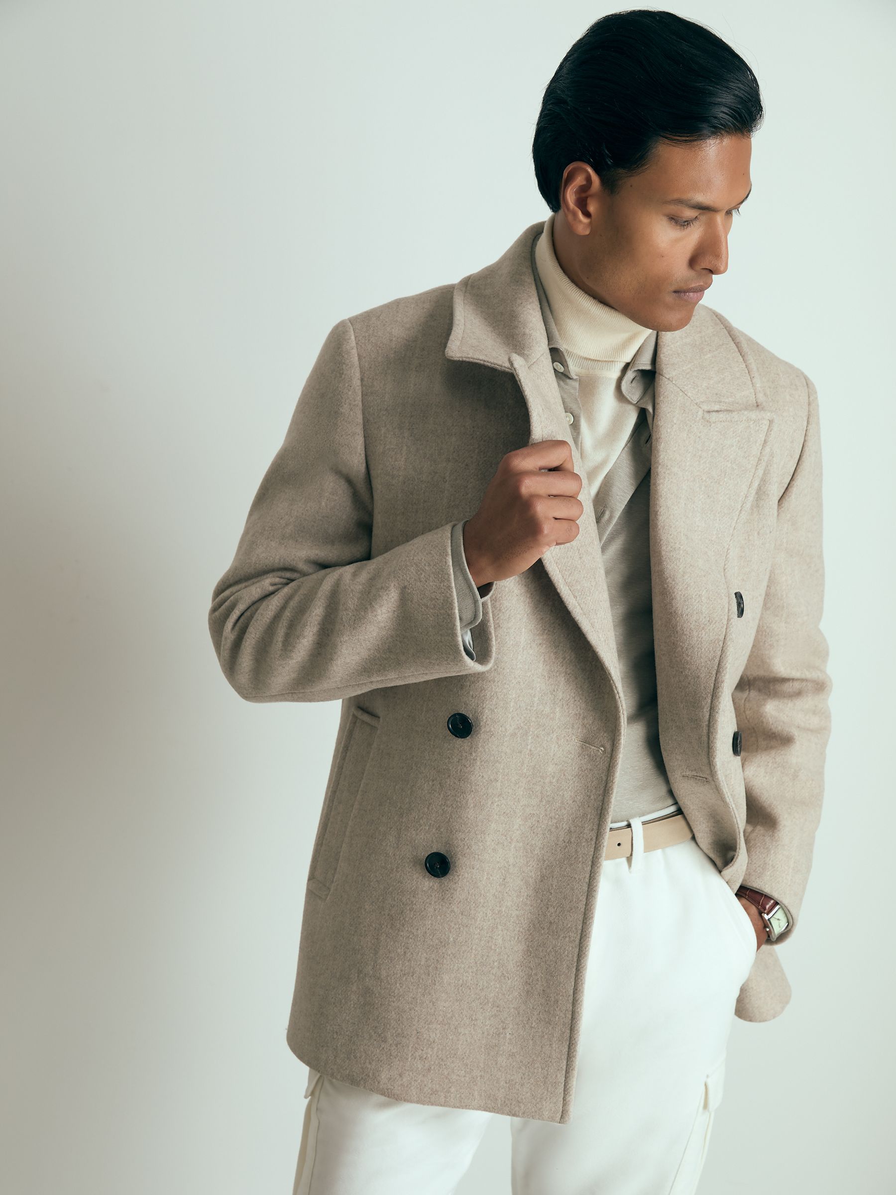Wool-Blend Pinstripe Pea Coat in Oatmeal