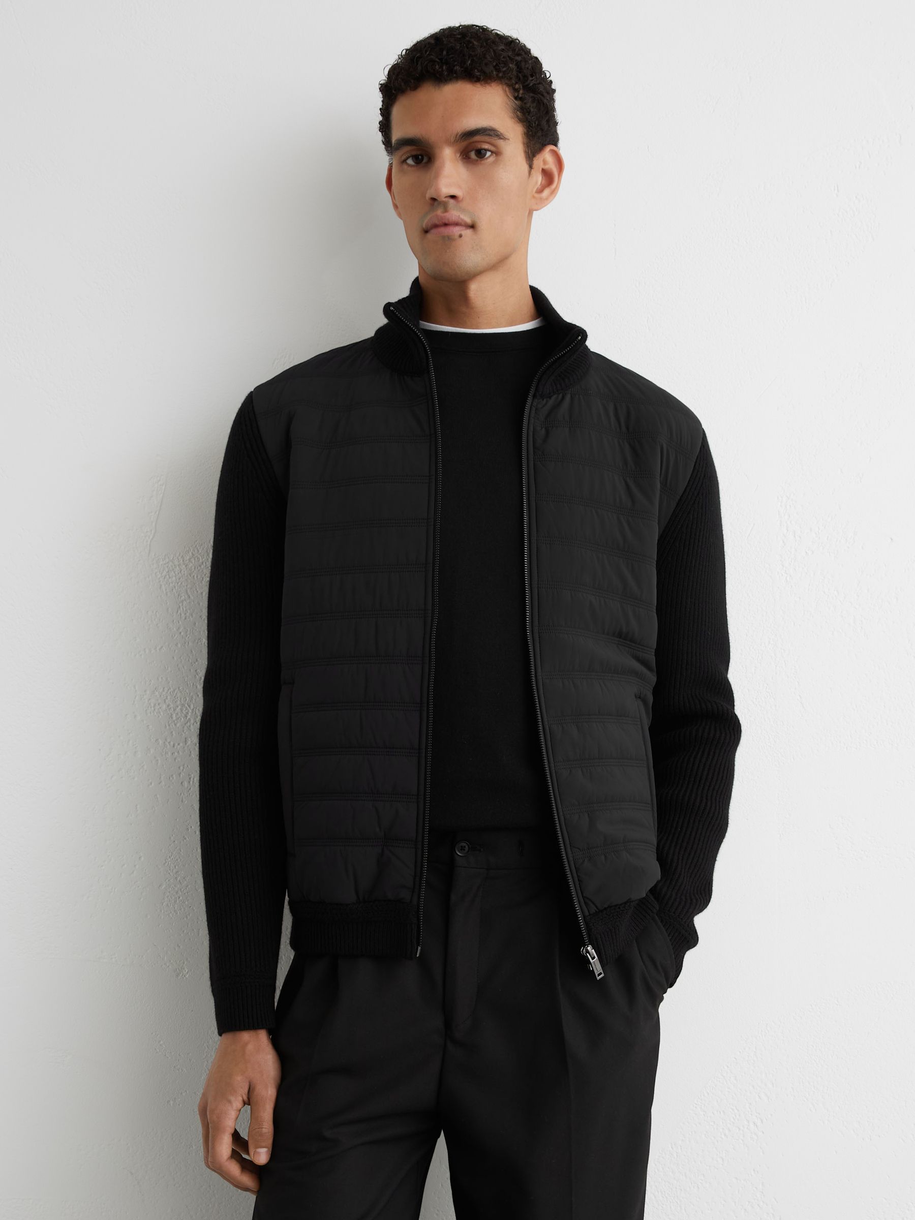 Quilted Rib-Knit Funnel-Neck Jacket in Black