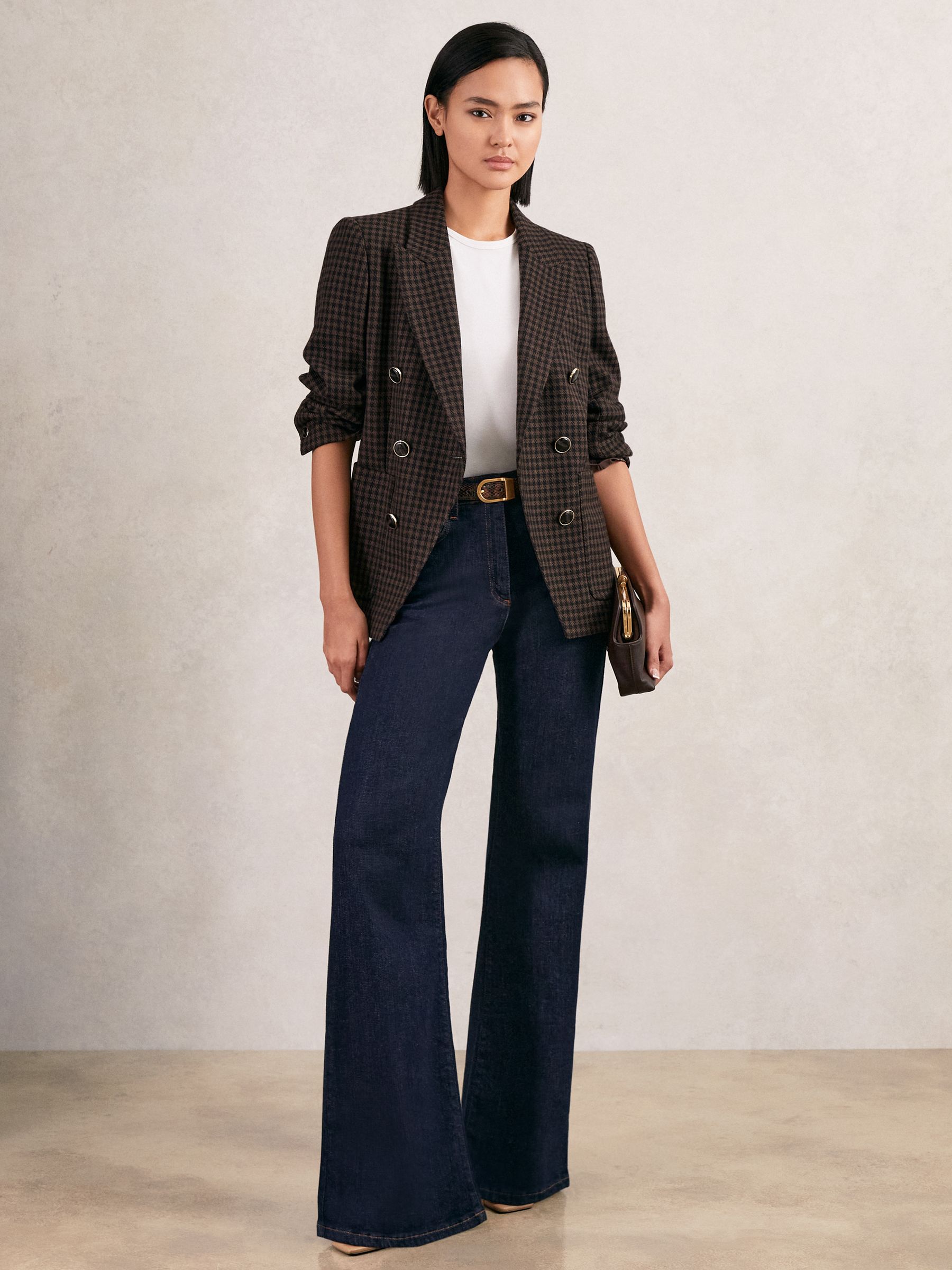 Wool-Blend Double-Breasted Check Blazer in Brown Check