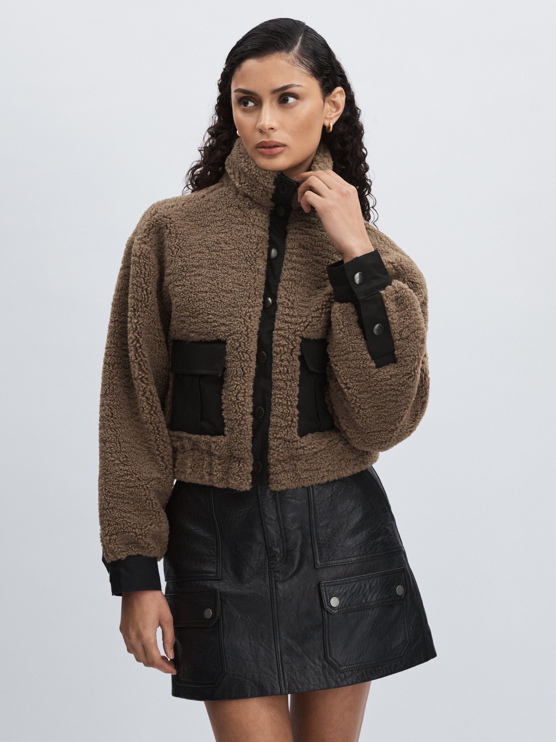 Paige Faux-Shearling Press-Stud Jacket in Cocoa