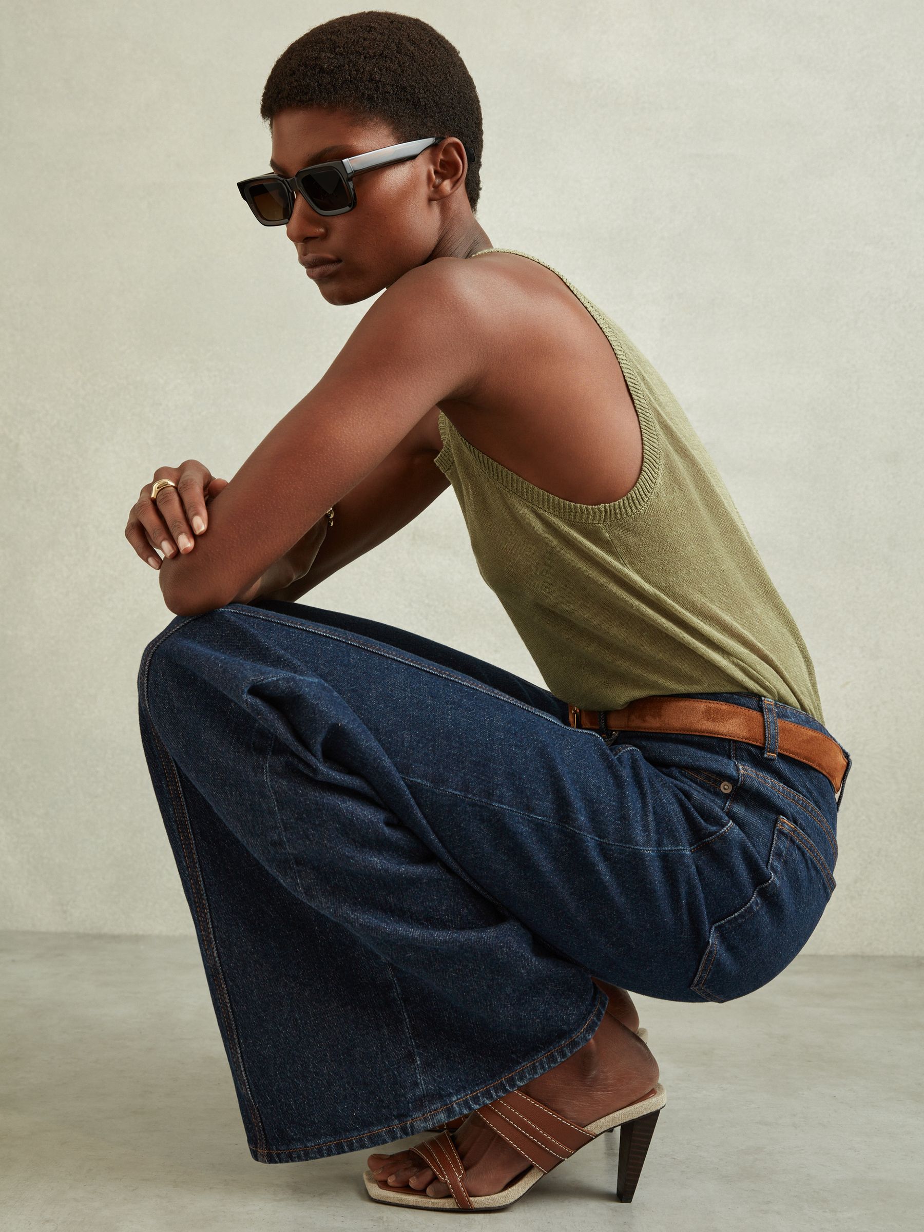 Belted Wide Leg Jeans in Dark Blue