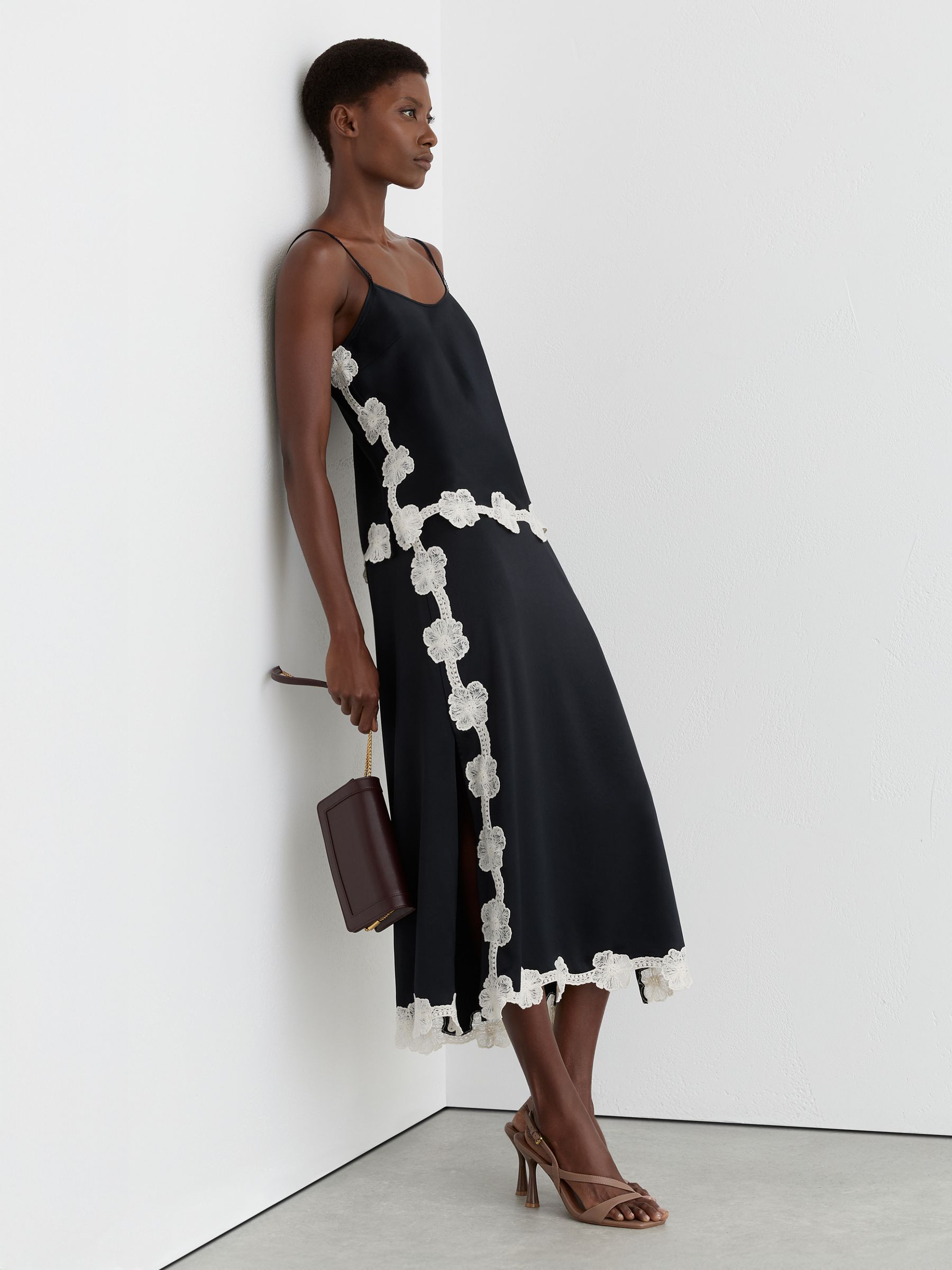 Satin Floral-Lace Trim Cami Top in Navy