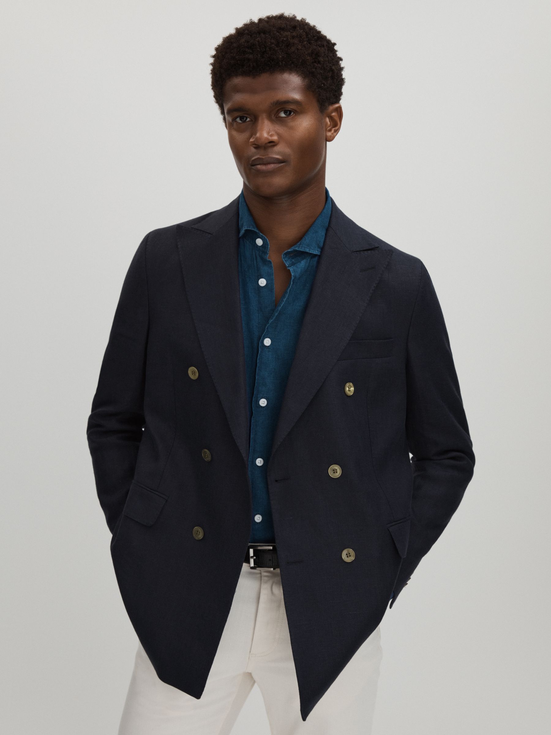 Oscar Jacobson Linen Single Breasted Blazer in Dark Blue